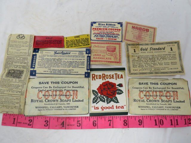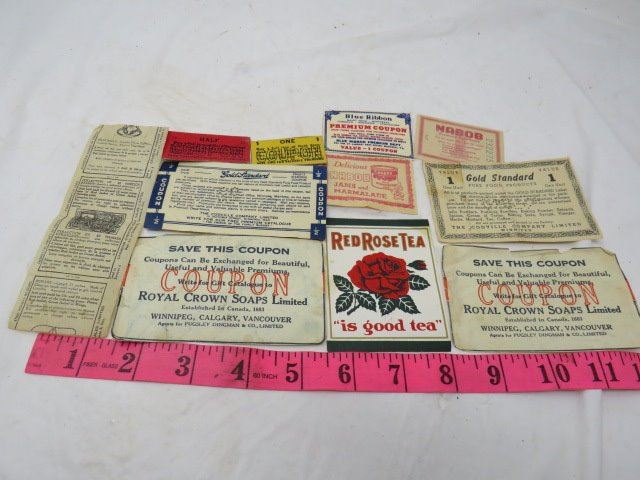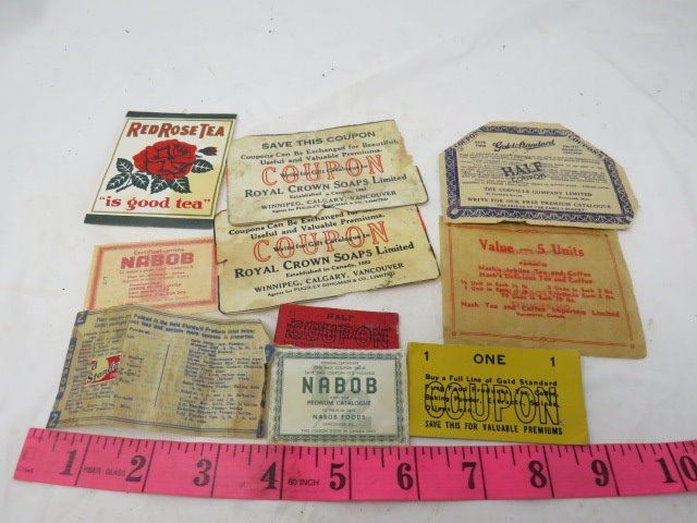 LOT OF ASSORTED HOUSEHOLD COUPONS (RED ROSE, NABOB, ROYAL CROWN) *VINTAGE*