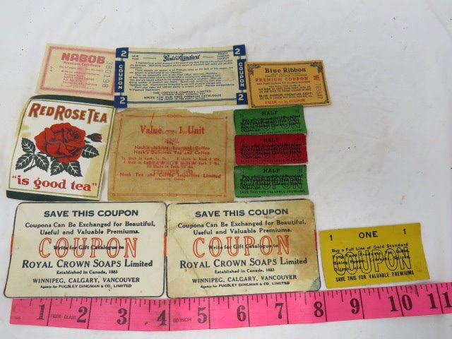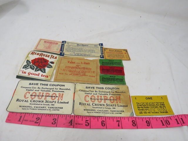LOT OF ASSORTED HOUSEHOLD COUPONS (RED ROSE, NABOB, ROYAL CROWN) *VINTAGE*