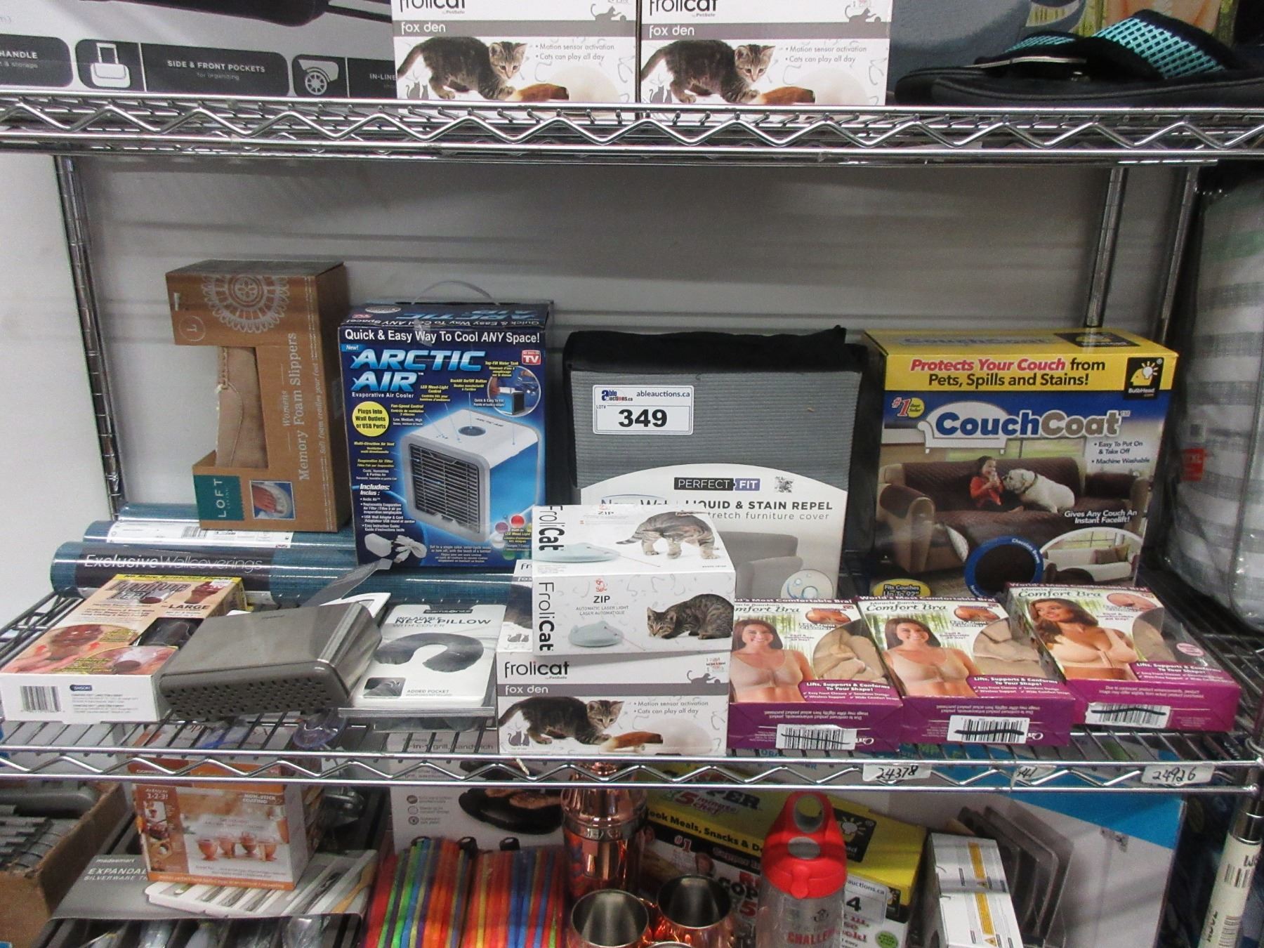 LOT OF ASSORTED HOUSEHOLD ITEMS, CAT TOYS, ARCTIC AIR COOLER, COMFORT BRAS, FURNITURE COVERS