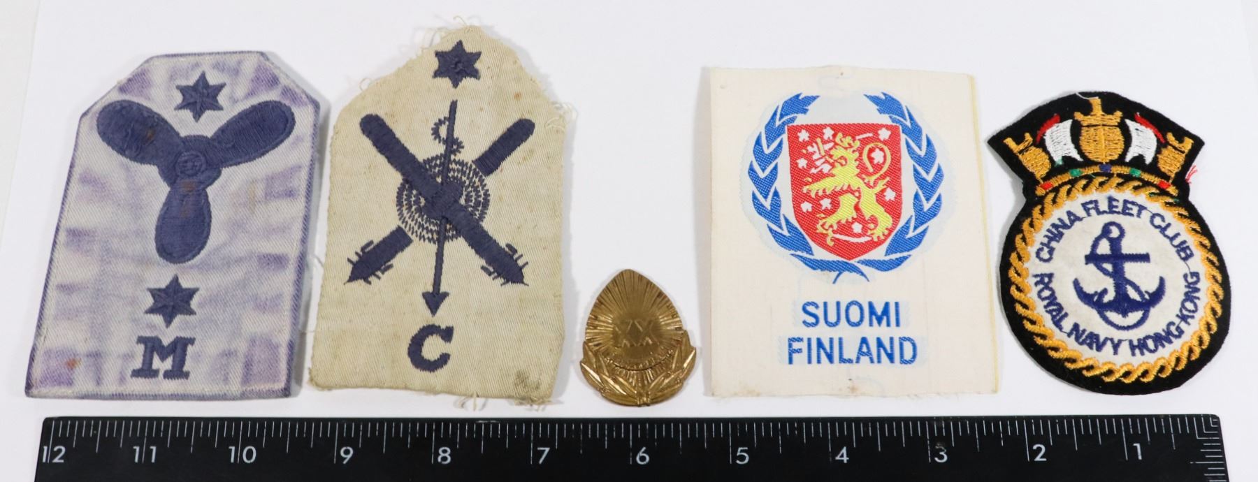 FINLAND SUOMI CLOTH PATCH, ROMANIAN COMMUNIST 20TH ANNIVERSARY MEDAL LIBERATION OF THE HOMELAND 1944 TO 1964 MISSING RIBBON/LOOP, CHINA FLEET CLUB ROYAL NAVY HONG KONG PATCH AND PAIR NAVY MILITARY CLOTH INSIGNIA VINTAGE