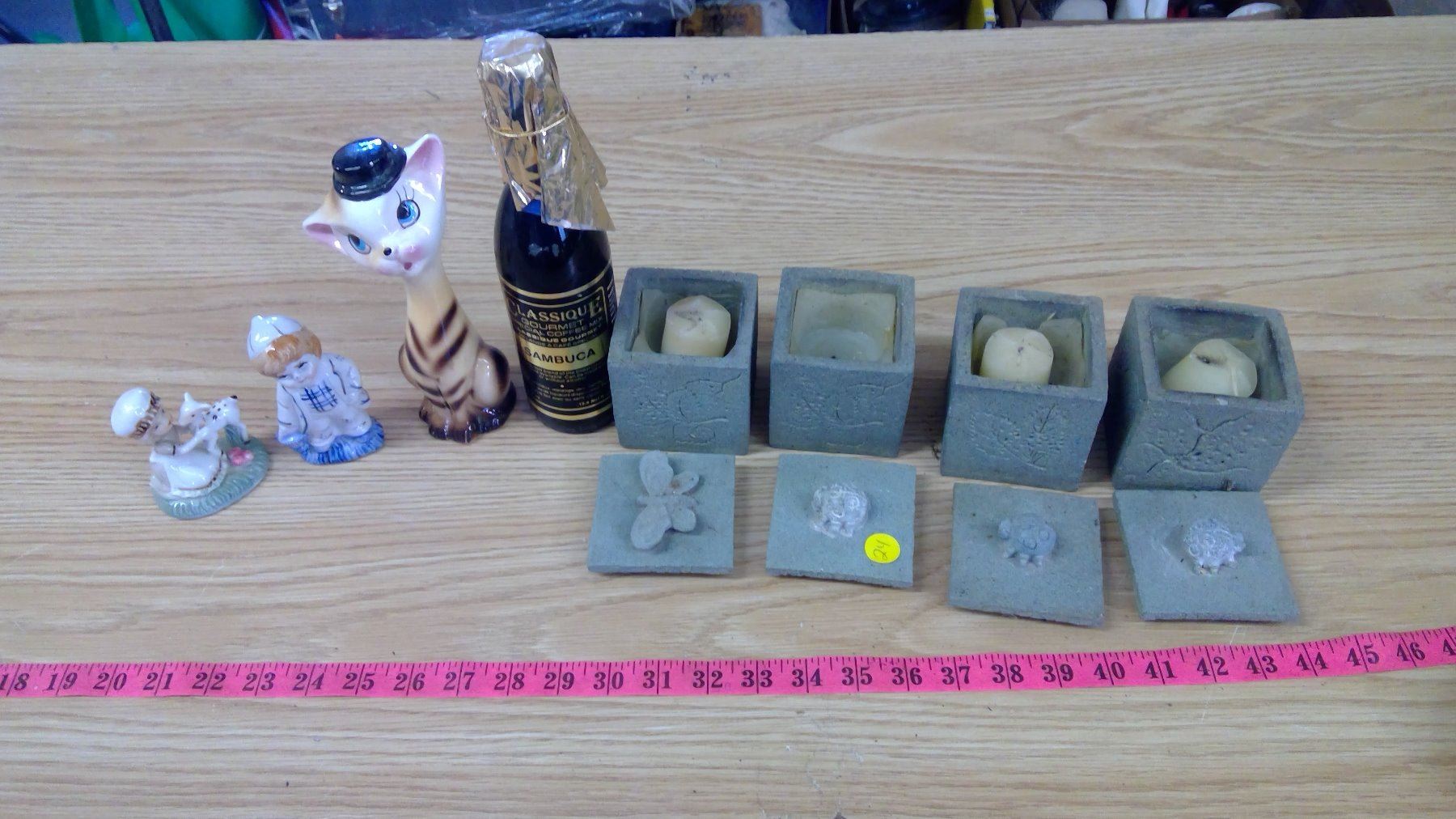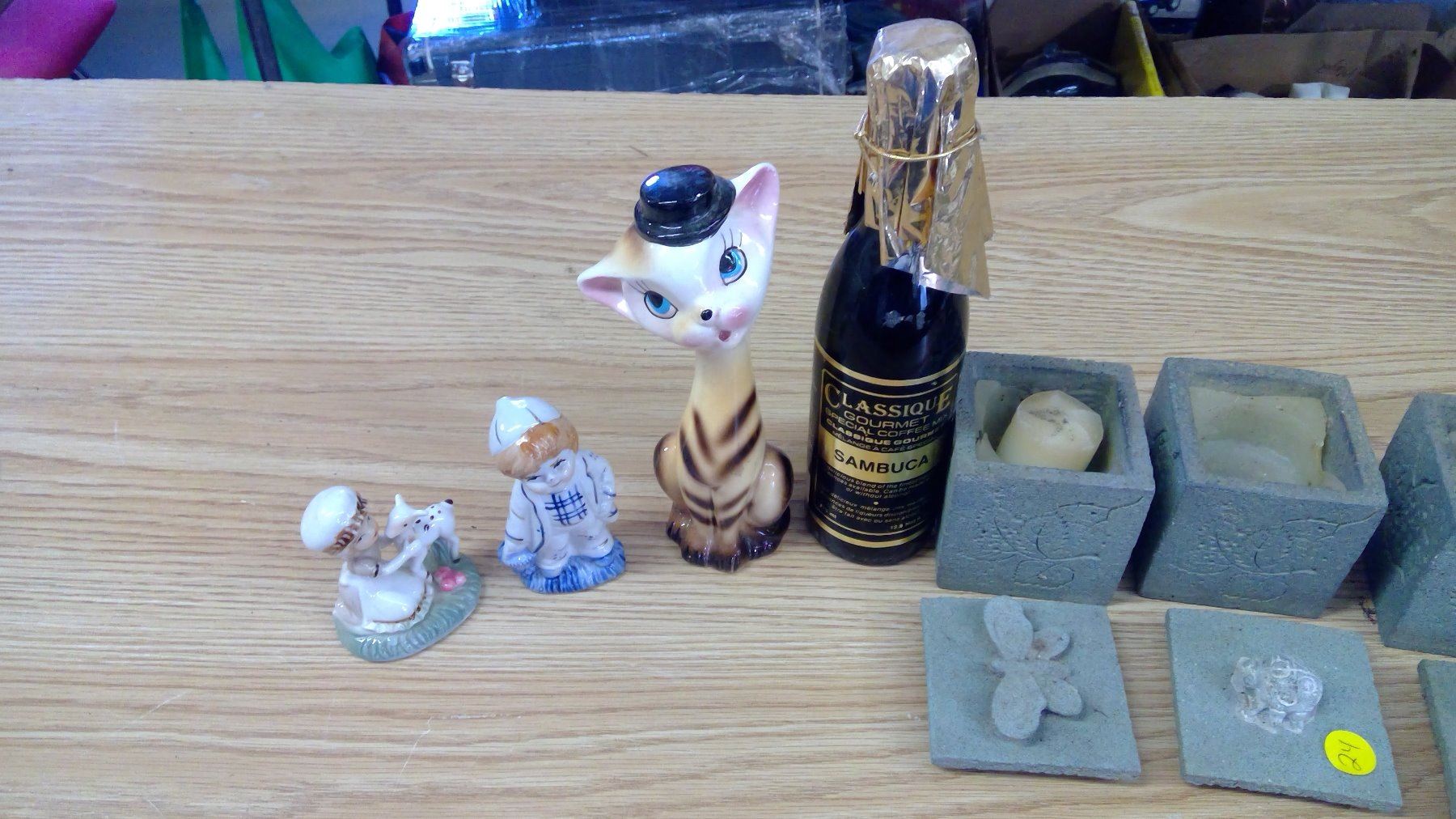 LOT OF ASSORTED ITEMS (CANDLES, FIGURINES, EXPIRY DATE UNKNOWN ON SAMBUCA FLAVOURING)