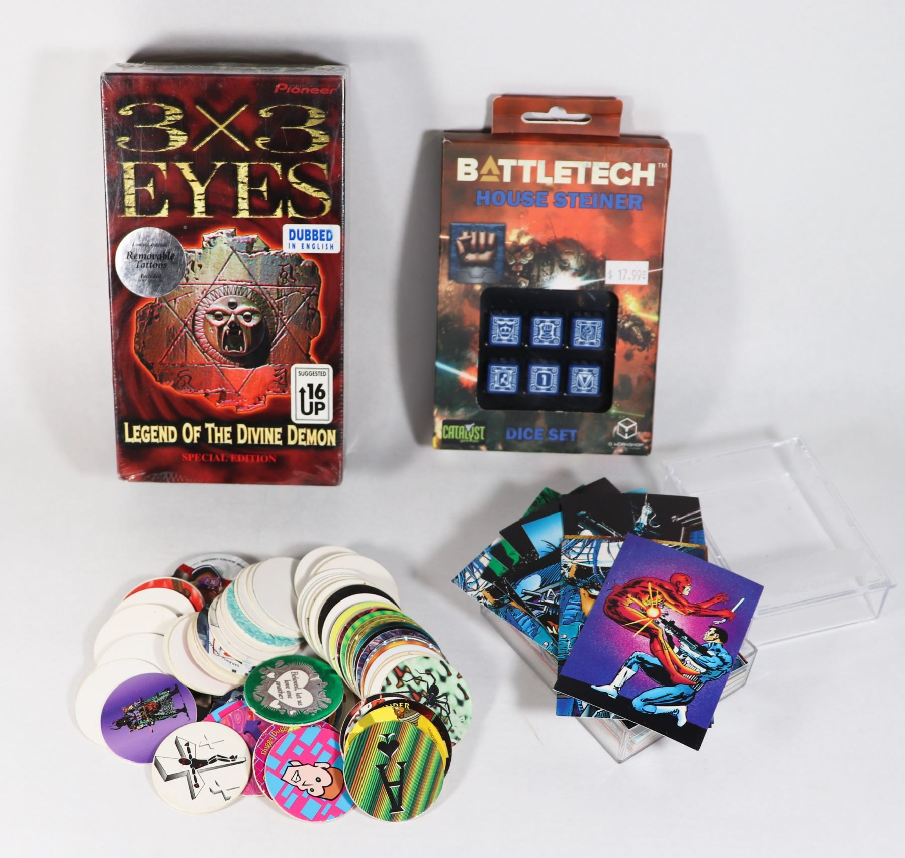 ANIME 3X3 EYES 2 TAPE SET, BOXED BATTLETECH HOUSE STEINER DICE SET, LOT OF THE PUNISHER WAR JOURNAL ENTRY CARDS AND LOT OF 1990'S POGS VINTAGE