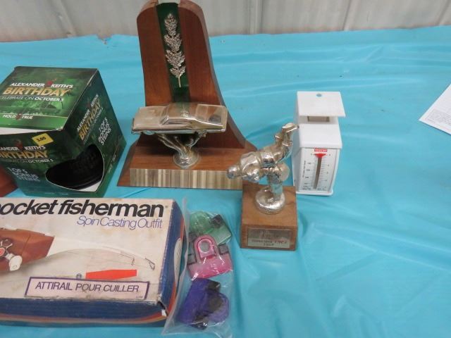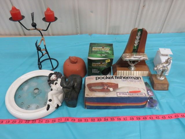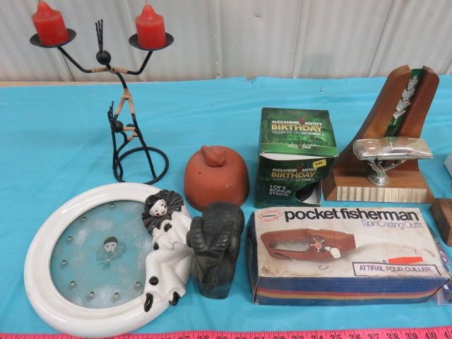 LOT OF ASSORTED ITEMS INCLUDING CANDLE HOLDER, POCKET FISHERMAN SPIN CASTING OUTFIT, ETC.