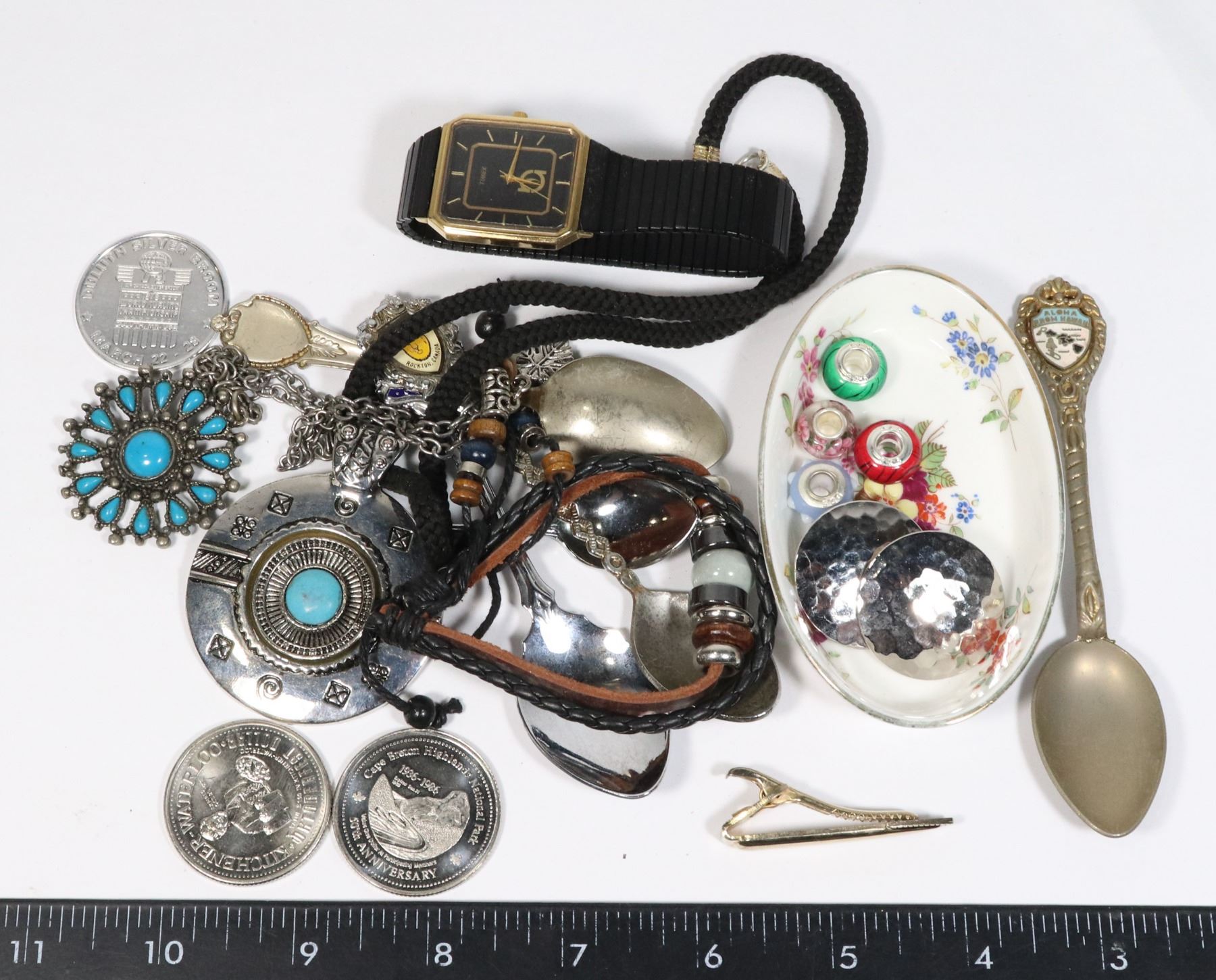 BEADS (NOT PANDORA), MADE IN ENGLAND MINI TRAY, TOKENS, SPOONS, WORKING TIMEX WATCH, AND MORE