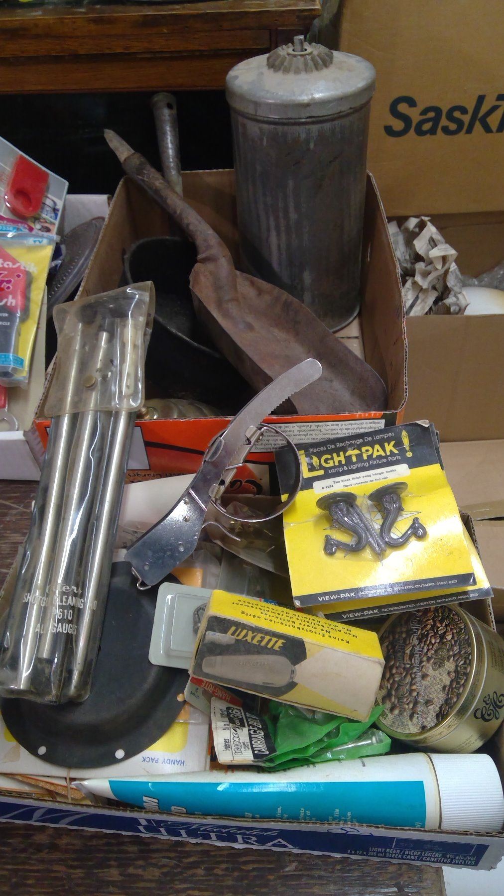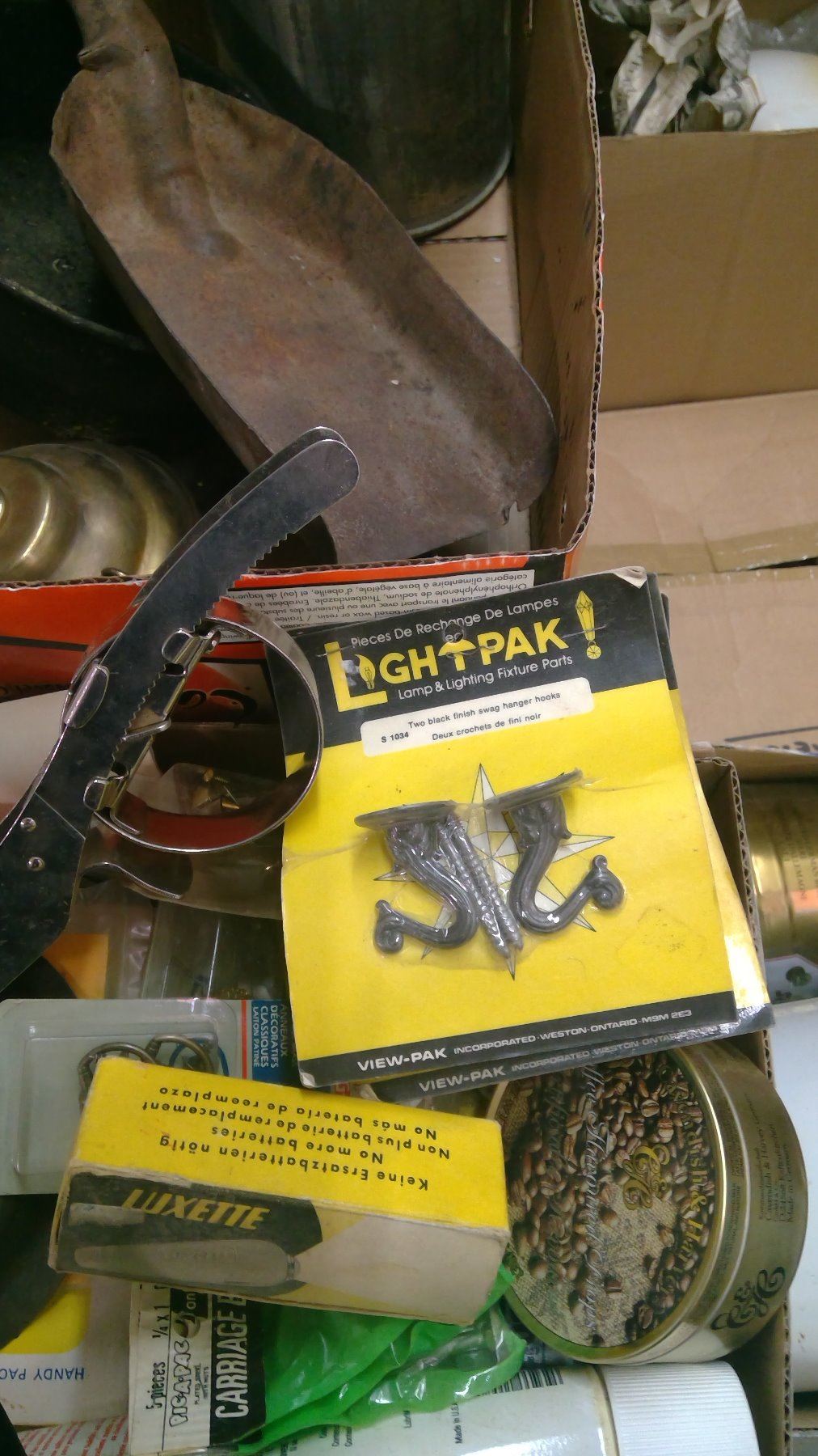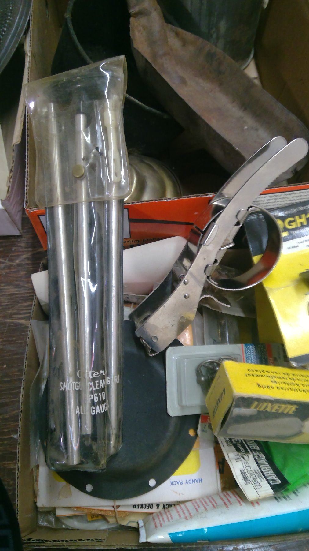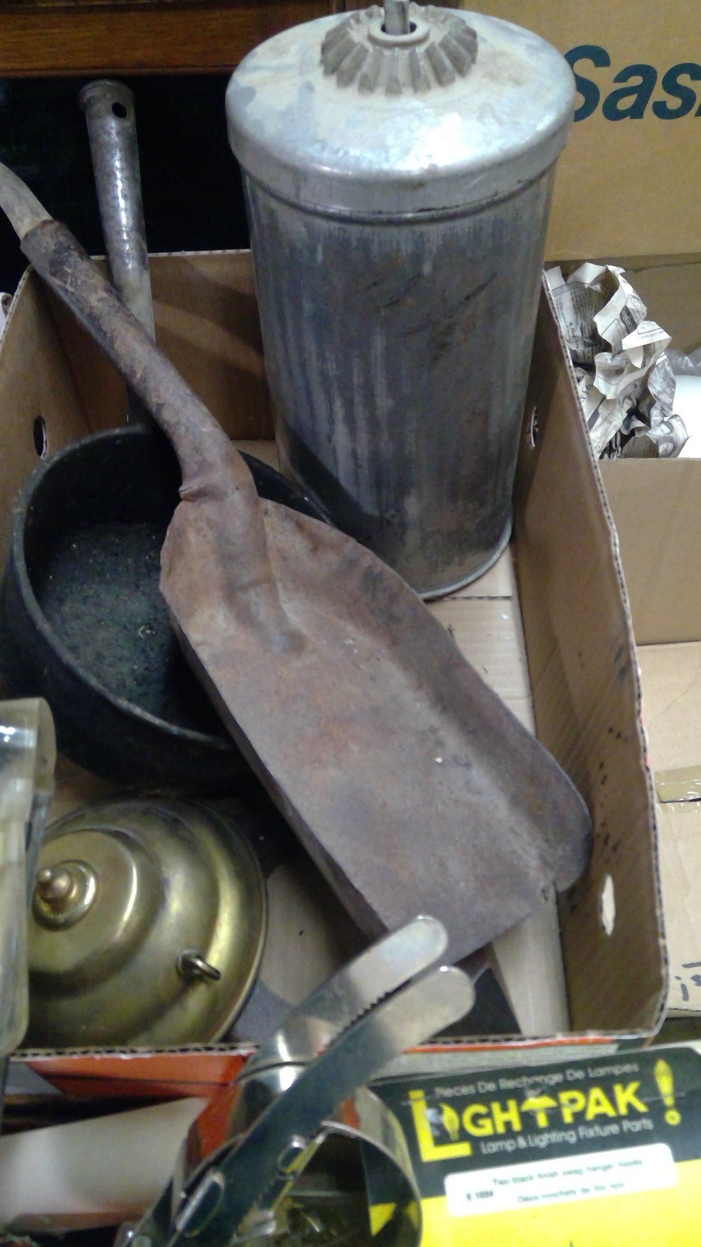 LOT OF ASSORTED ITEMS - LAMP FIXTURE PARTS, SHOTGUN CLEANING ROD, COAL SHOVEL, ETC.