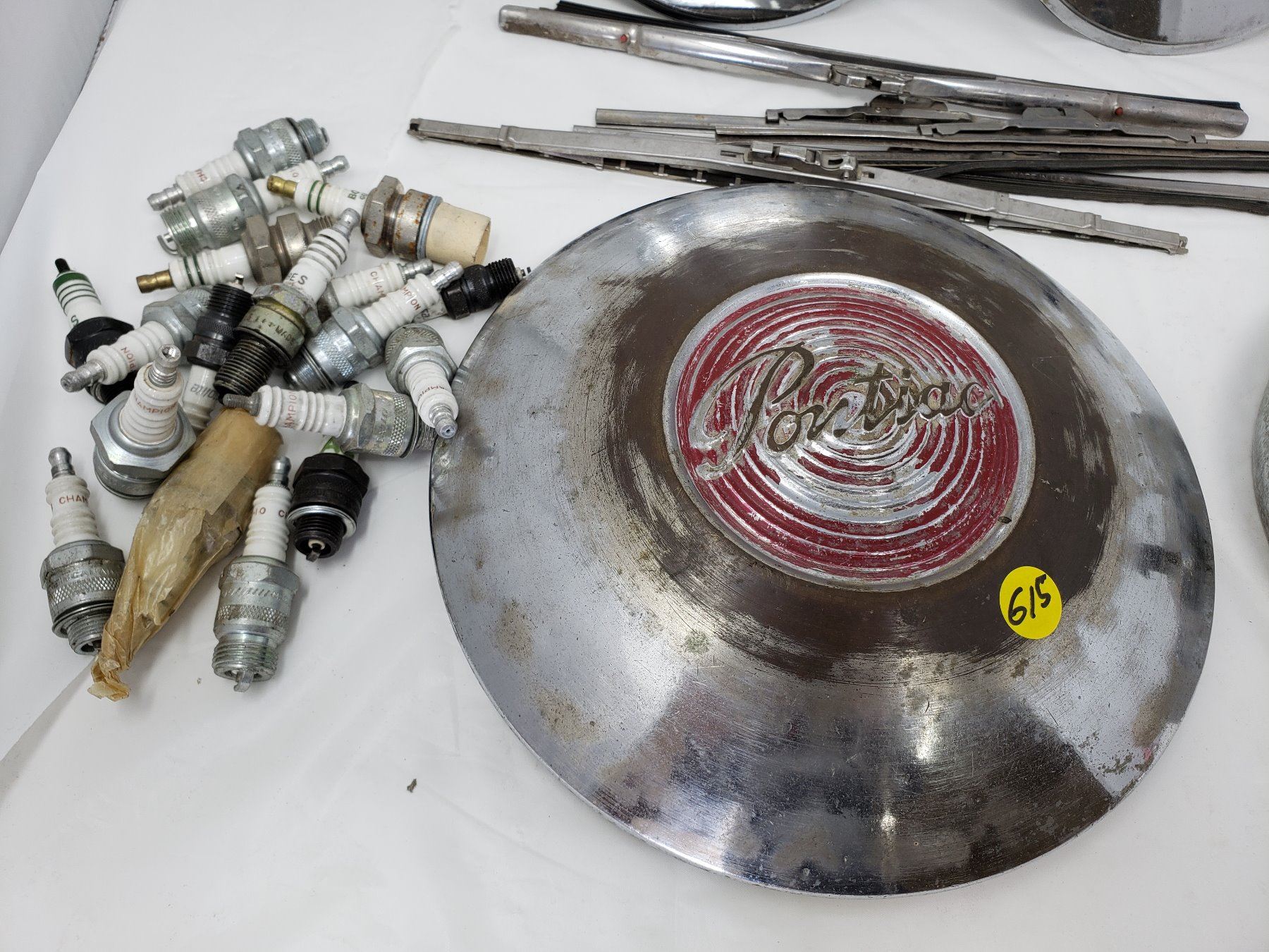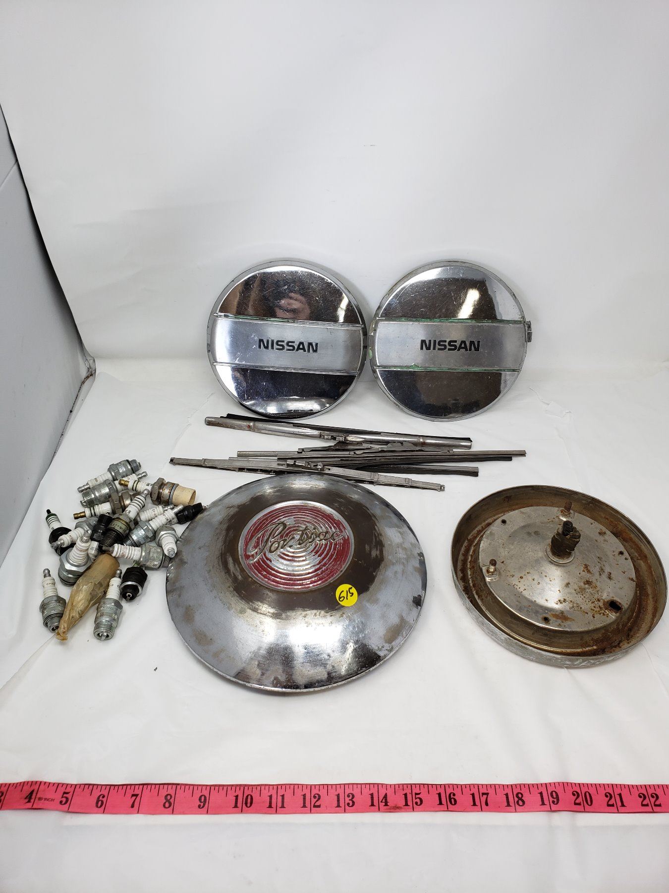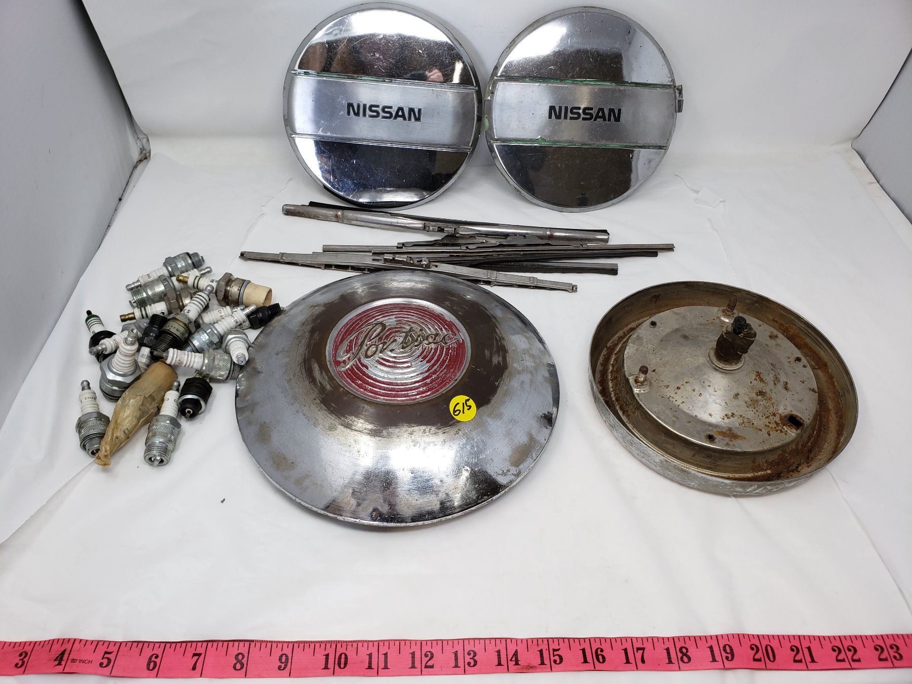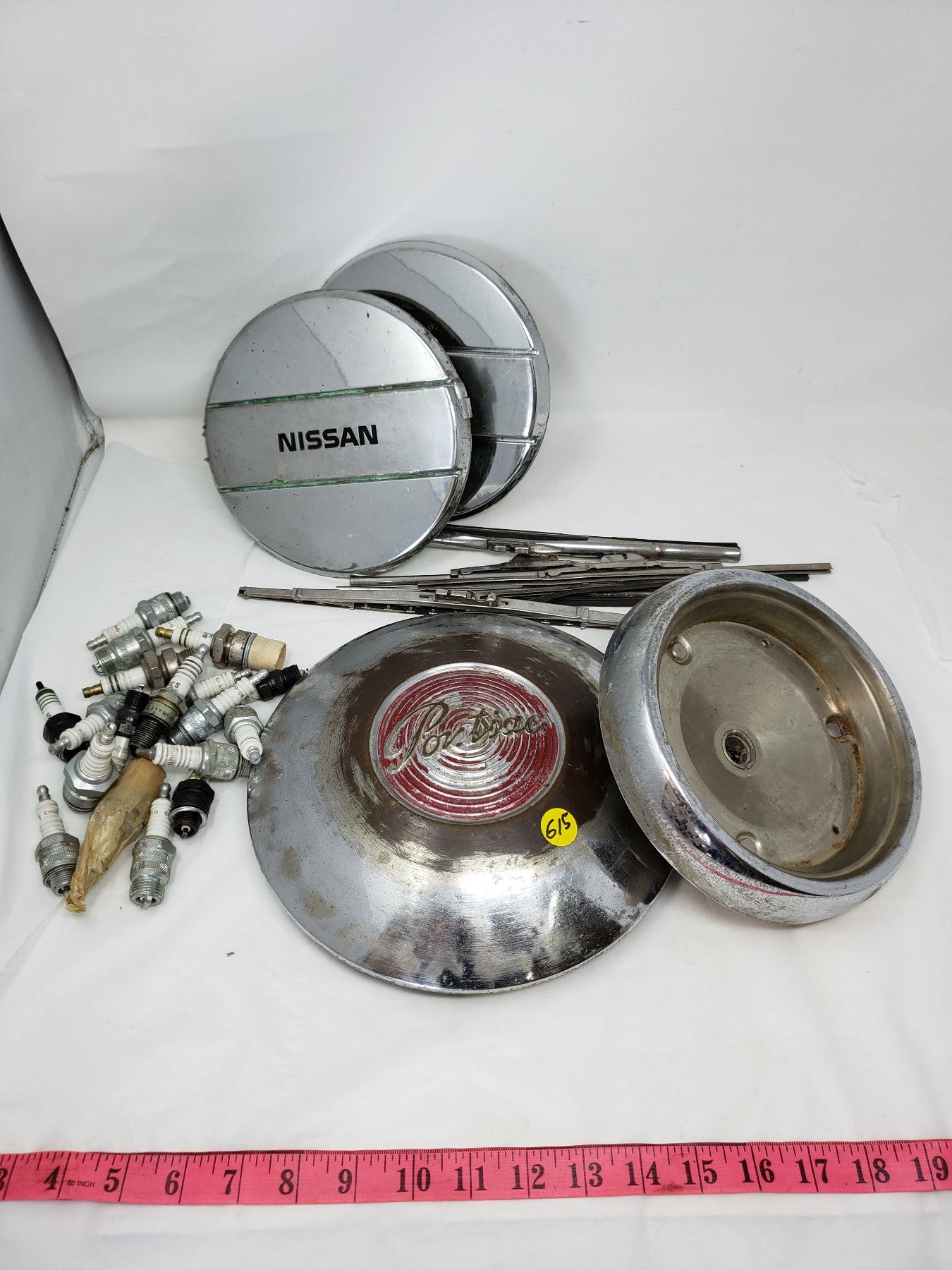 LOT OF ASSORTED ITEMS (PONTIAC HUBCAP, WIPER BLADES, SPARK PLUGS, NISSAN CAPS ETC…) *VINTAGE*