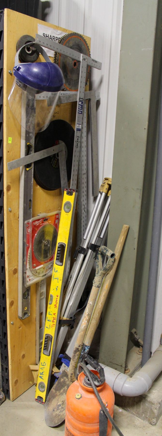 LOT OF ASSORTED LEVELS, SQUARES, CUT OFF SAW