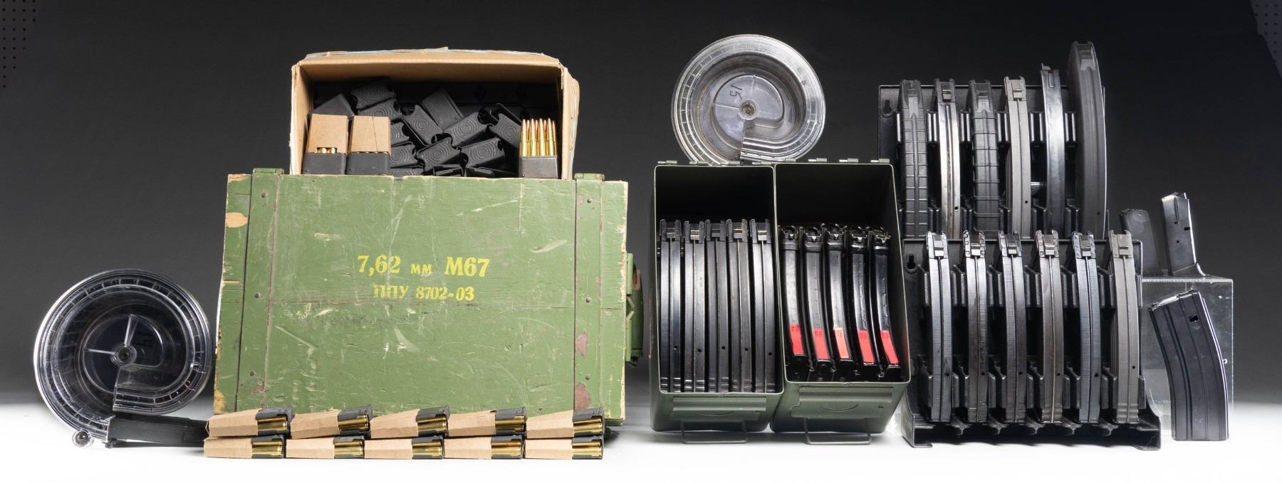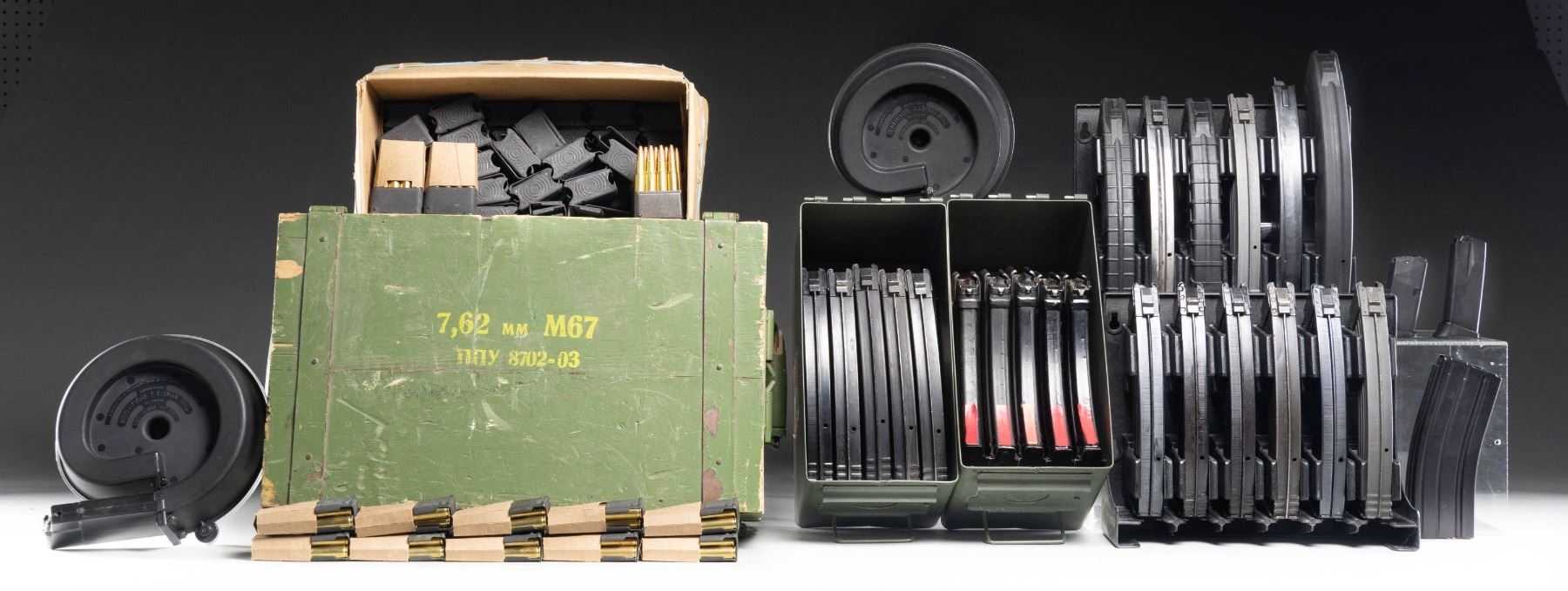 .30-06 AMMUNITION. Lot of assorted mags., M1 Garand enblocs, and .30-06 ammunition, including: 1) x2 steel ammo cans, each containing x10 steel 30-rd. 7.62x39mm AK mags. 2) 1 ammunition crate (marked in Cyriliic) containing x10 steel 30-rd. 7.62x39mm AK mags. and 2 Plano 50-rd. blue plastic cartridge boxes. 3) x7 steel 30-rd. 7.62x39mm AK mags., x1 black polymer TAPCO 30-rd. 7.62x39mm AK mag., x1 black polymer PROMAG 30-rd. 7.62x39mm AK mag., x1 black polymer Bulgarian 40-rd. 7.62x39mm AK mag., and x1 unmarked blued steel 30-rd. Ruger Mini-14 mag., all retained in 2 5-slot black plastic mag. holders. 4) x1 American Tactical 30-rd. 5.56x45mm mag. 5) x2 M.W.G. "The Ninety Rounder" 90-rd. AR-15 drum mags. 6) x1 Glock .40 S&W 9-rd. mag. 7) x1 SCCY pistol mag. 8) x13 loaded M1 Garand enbloc mags. (approx. 104-rds. total). 9) Approx. 150 empty M1 Garand enblocs. CONDITION: mags. and enblocs are good, showing varying degrees of wear and some superficial marks from handling and storage, while appearing sturdy and serviceable. Ammunition all appears serviceable. (02-24641/MLW). NON-GUN/AMMO. $200-400.