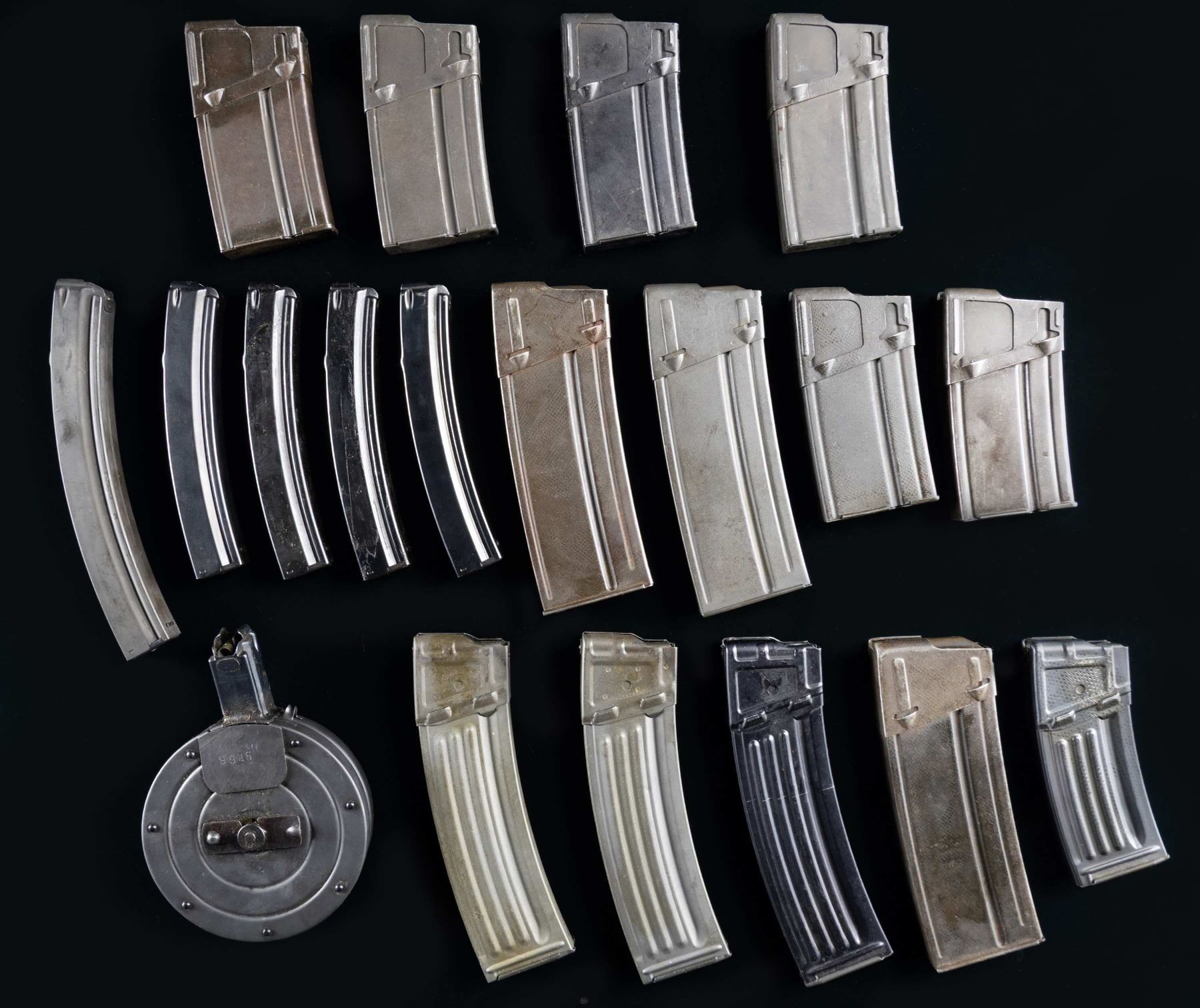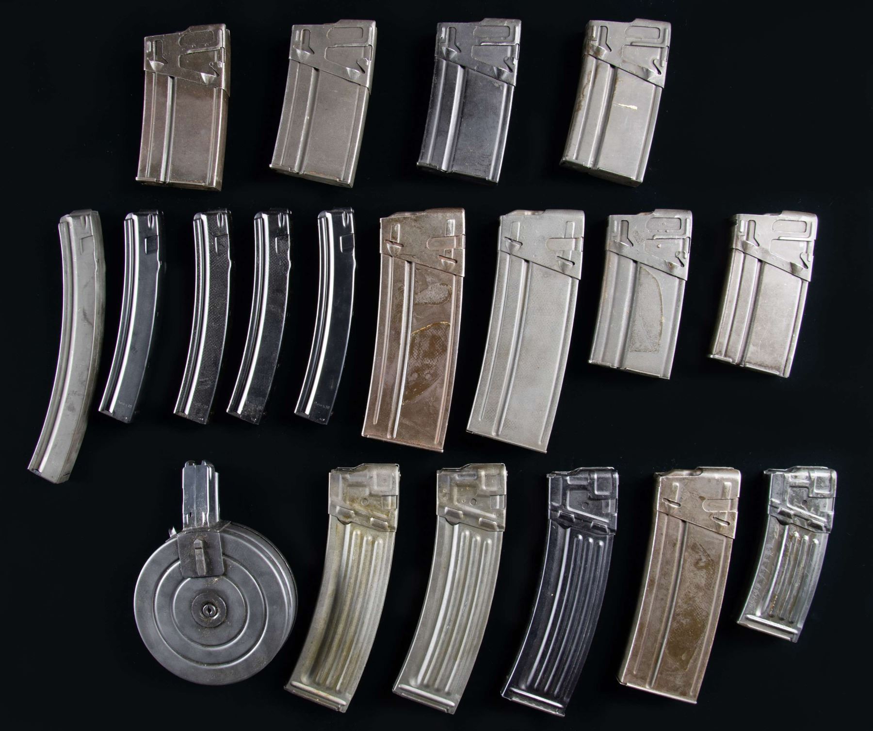 Lot consists of assorted MP5, HK53, and CETME rifle mags., including: 1) x4 undated HK MP5 30-rd. mags. Steel construction with blue finish. 2) x1 MCP 40-rd. mag. Steel construction with parkerized finish. 3) x1 Russian PPSh-41 mag. converted for use with the MP5 via the addition of the top 2 1/4" of an MP5 mag. for feeding. 4) x1 HK53 30-rd. mag. Left side of body is marked "5,56x45" followed by date code "ID" (83). Steel construction with dull blue finish. 5) x3 unmarked HK53 pattern 40-rd. mags. 1 of aluminum construction with black enamel finish, 2 of steel construction with parkerized finish. 6) x6 CETME 20-rd. mags. Steel construction with parkerized finish, save for one, which exhibits a black enamel type finish. 7) x3 (approx.) 25-rd. CETME mags. CONDITION: mags. are good, showing varying degrees of wear, with all otherwise appearing sturdy and serviceable. (02-24536-5/MLW). $300-500.