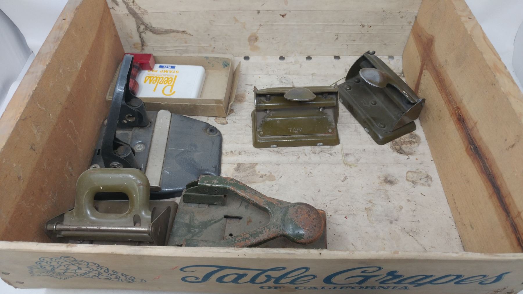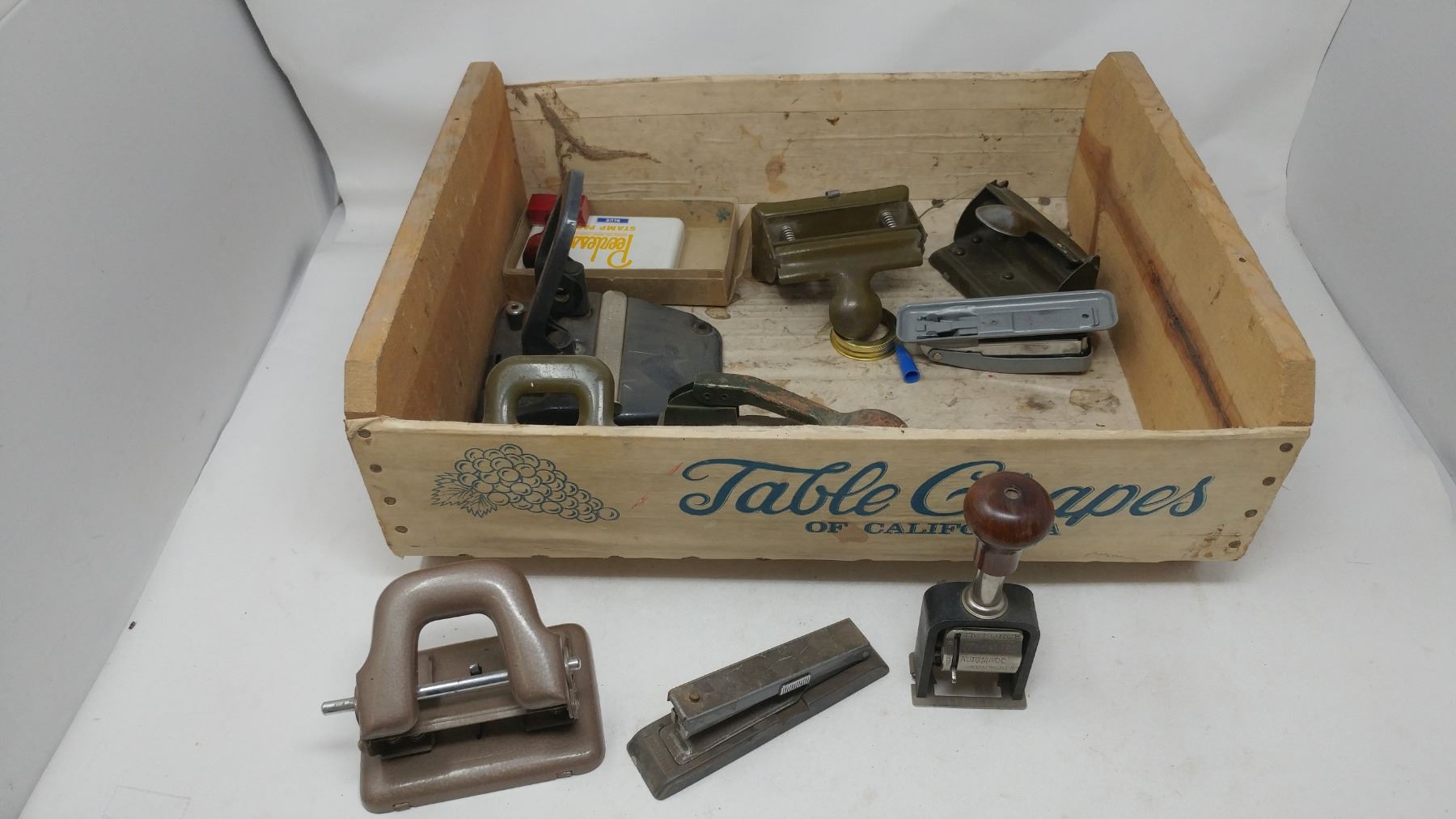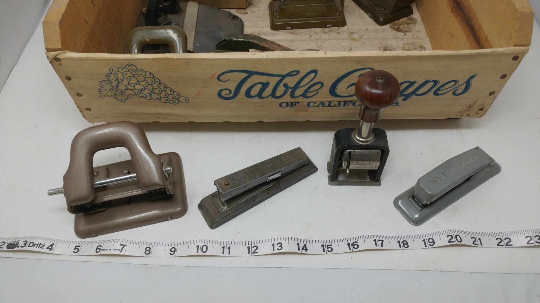 LOT OF ASSORTED OFFICE SUPPLIES (STAPLERS, HOLE PUNCHES, STAMPERS, ETC.)