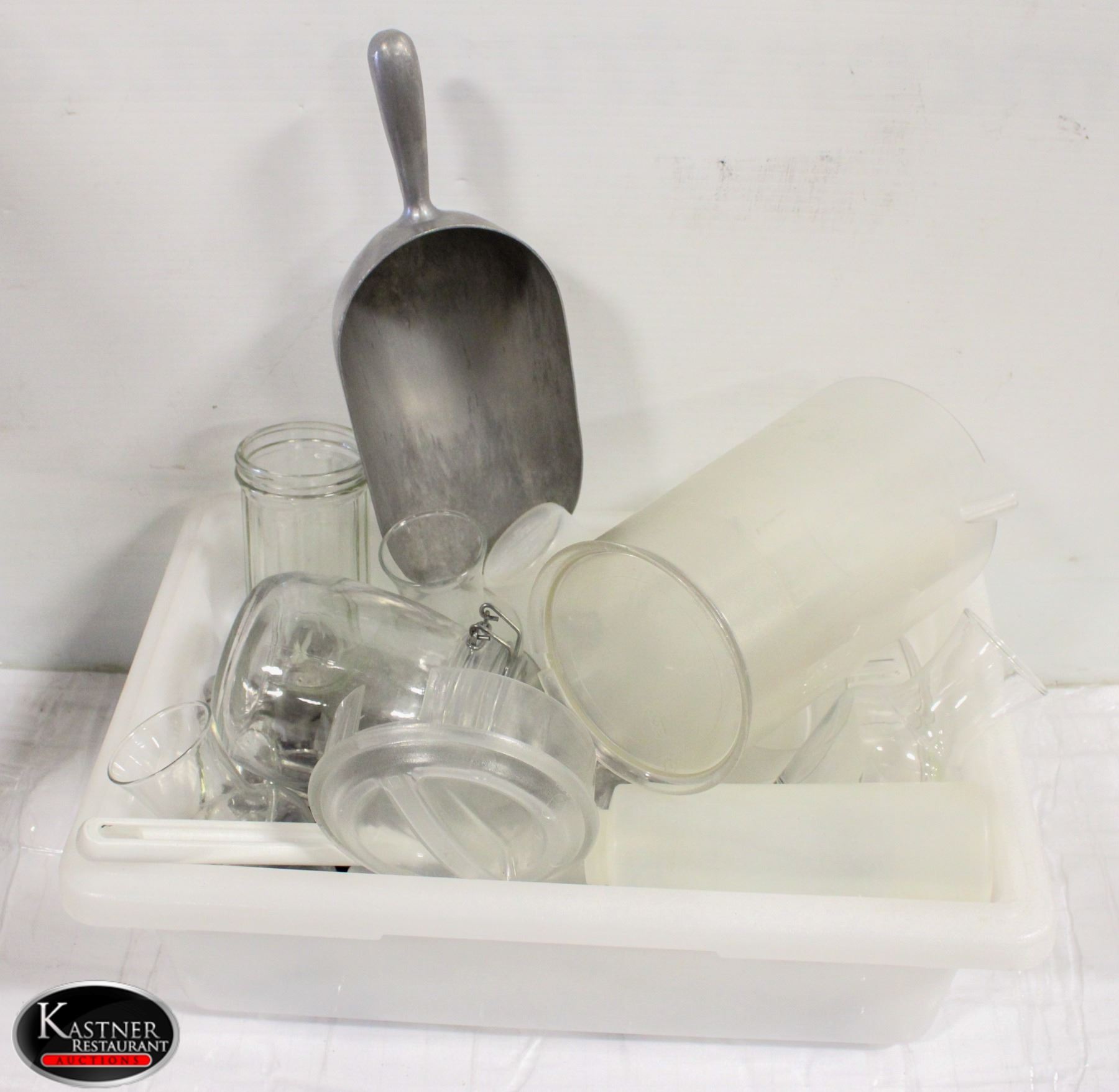LOT OF ASSORTED PLASTIC PITCHERS+GLASS KITCHENWARE