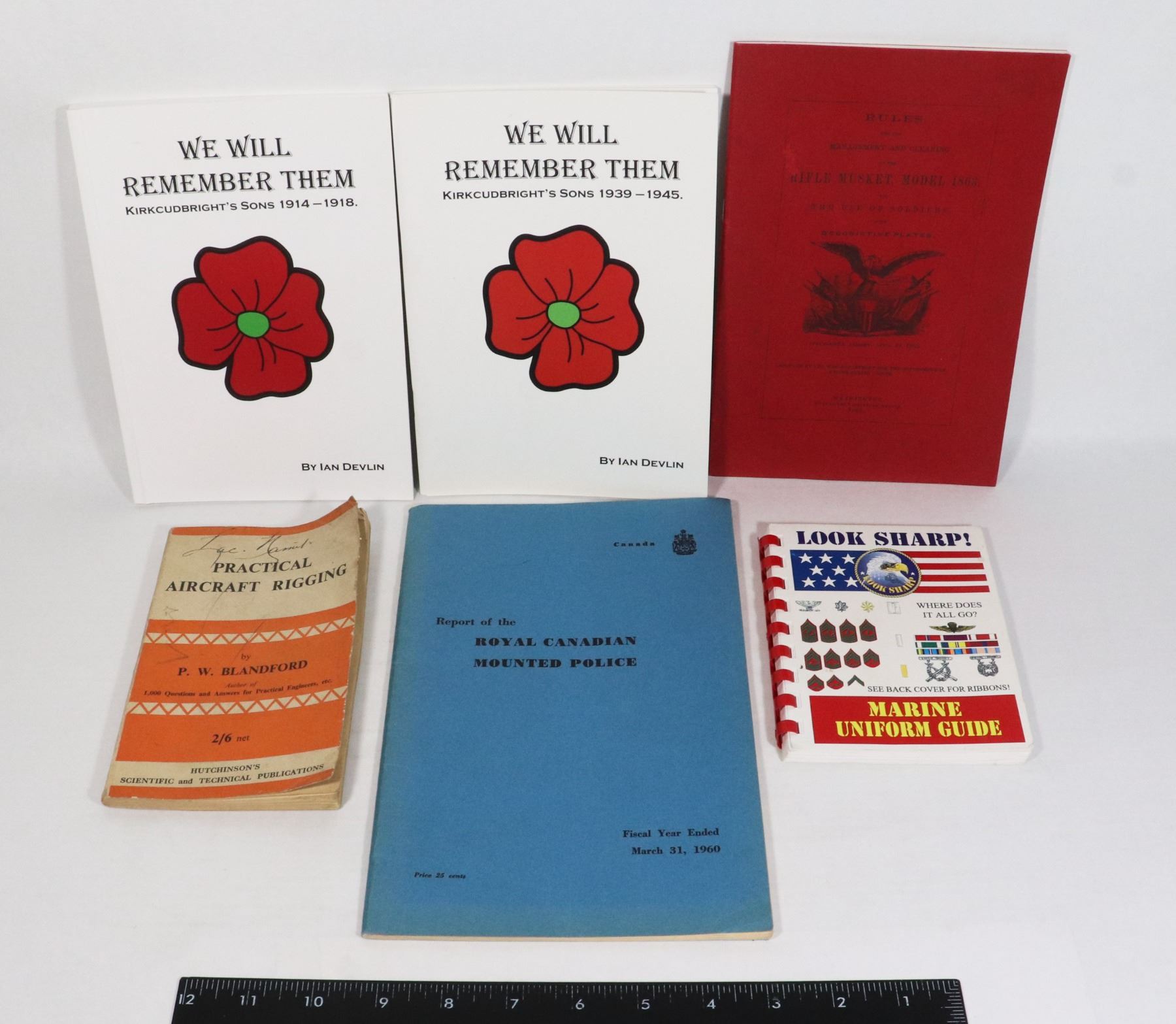 INCLUDING PRACTICAL AIRCRAFT RIGGING, RCMP FISCAL YEAR ENDED 1960, USA RIFLE MUSKET MODEL 1863 USE BOOK, MARINE UNIFORM GUIDE, AND TWO REMEMBRANCE DAY BOOKS