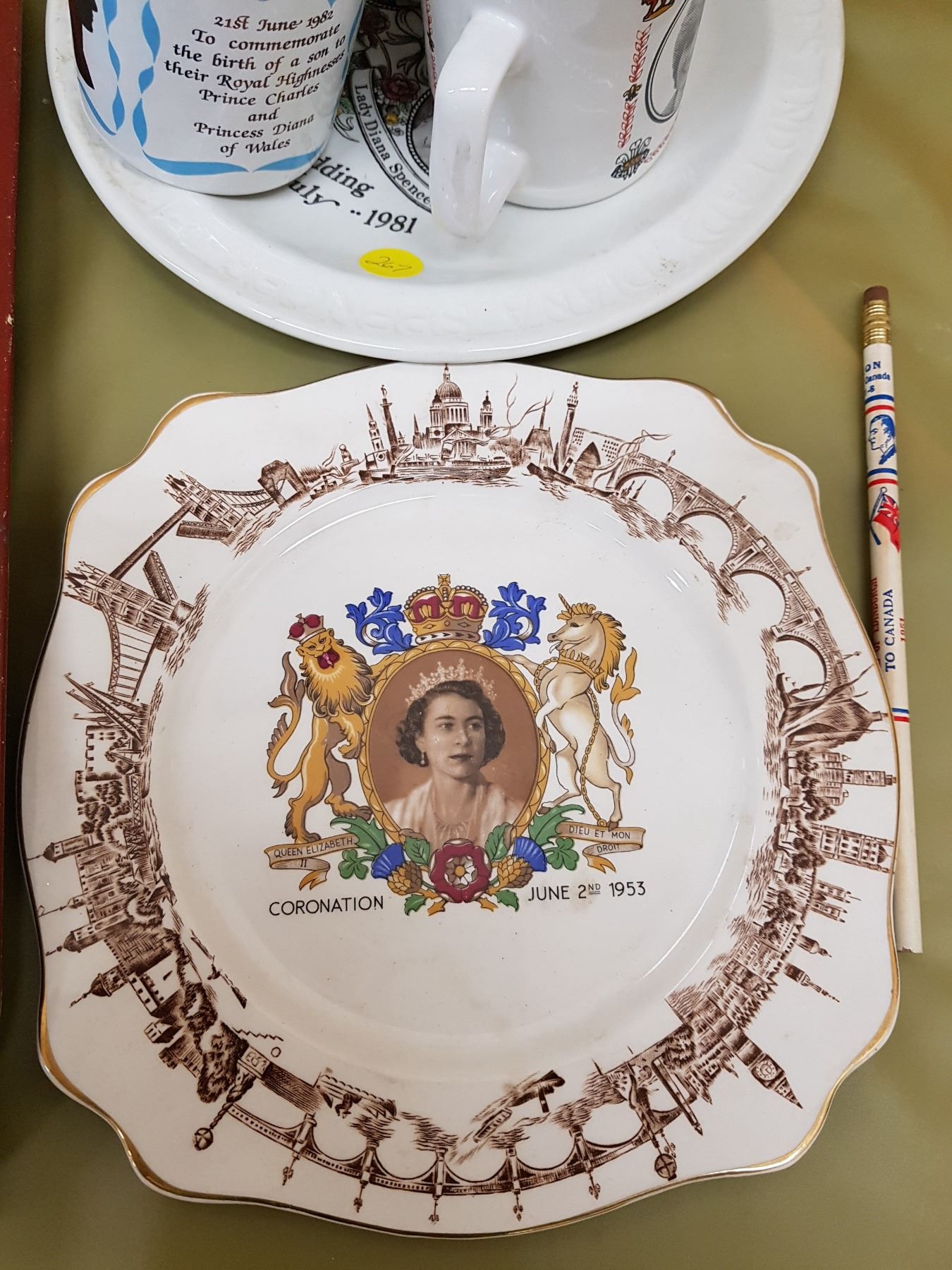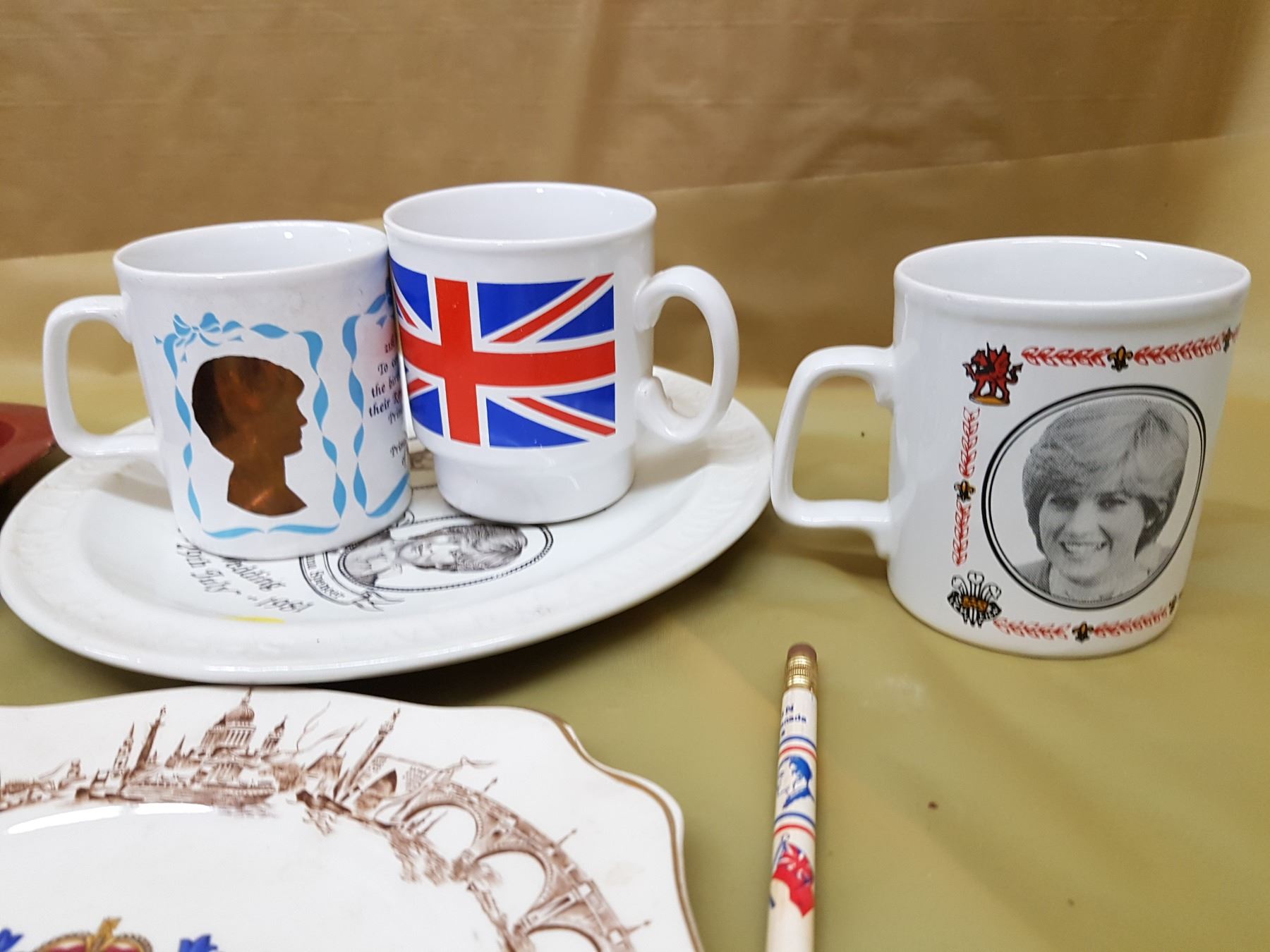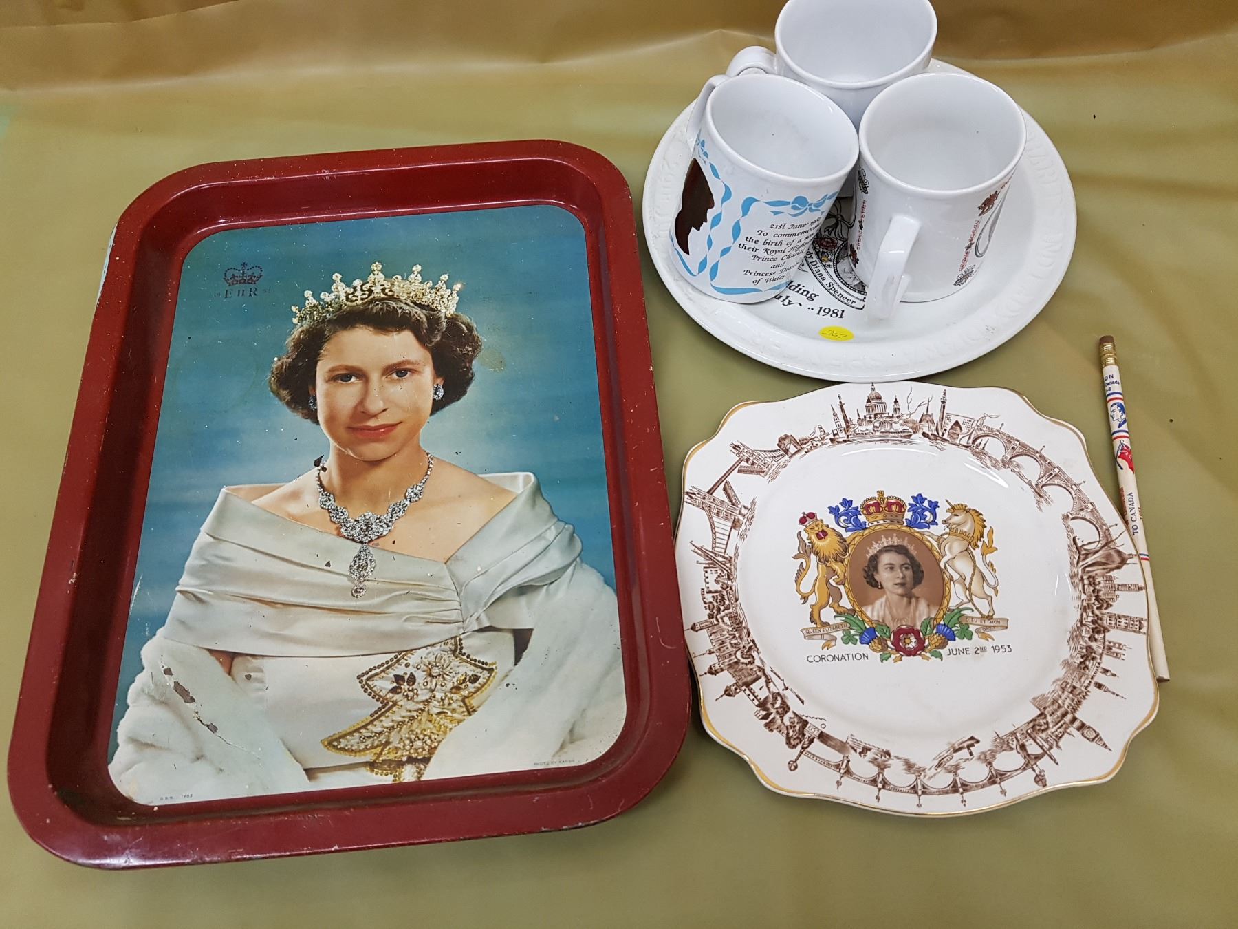 LOT OF ASSORTED ROYALTY ITEMS (TRAY, MUGS, PLATES, PENCIL)