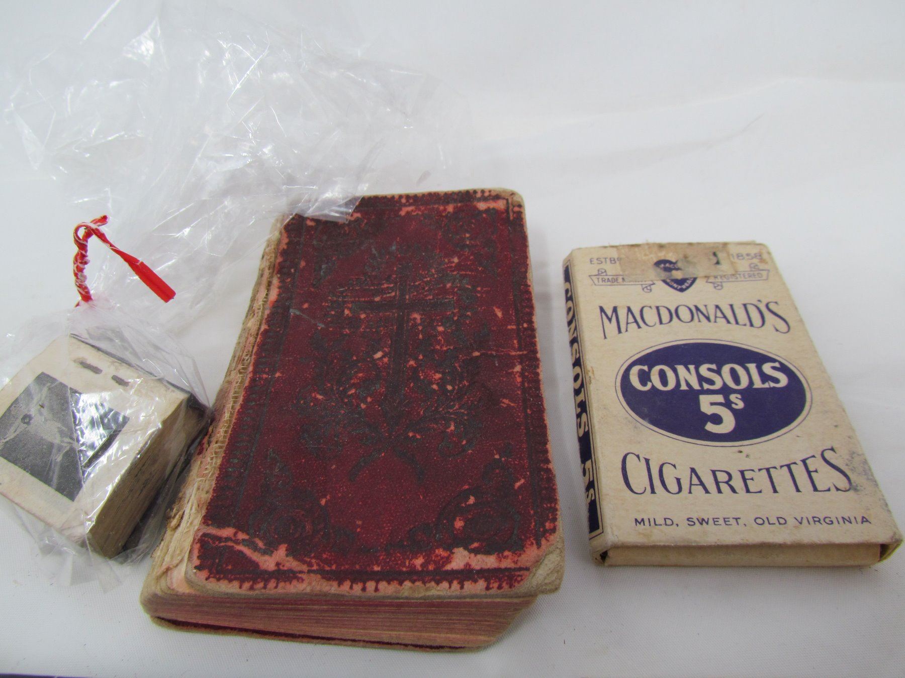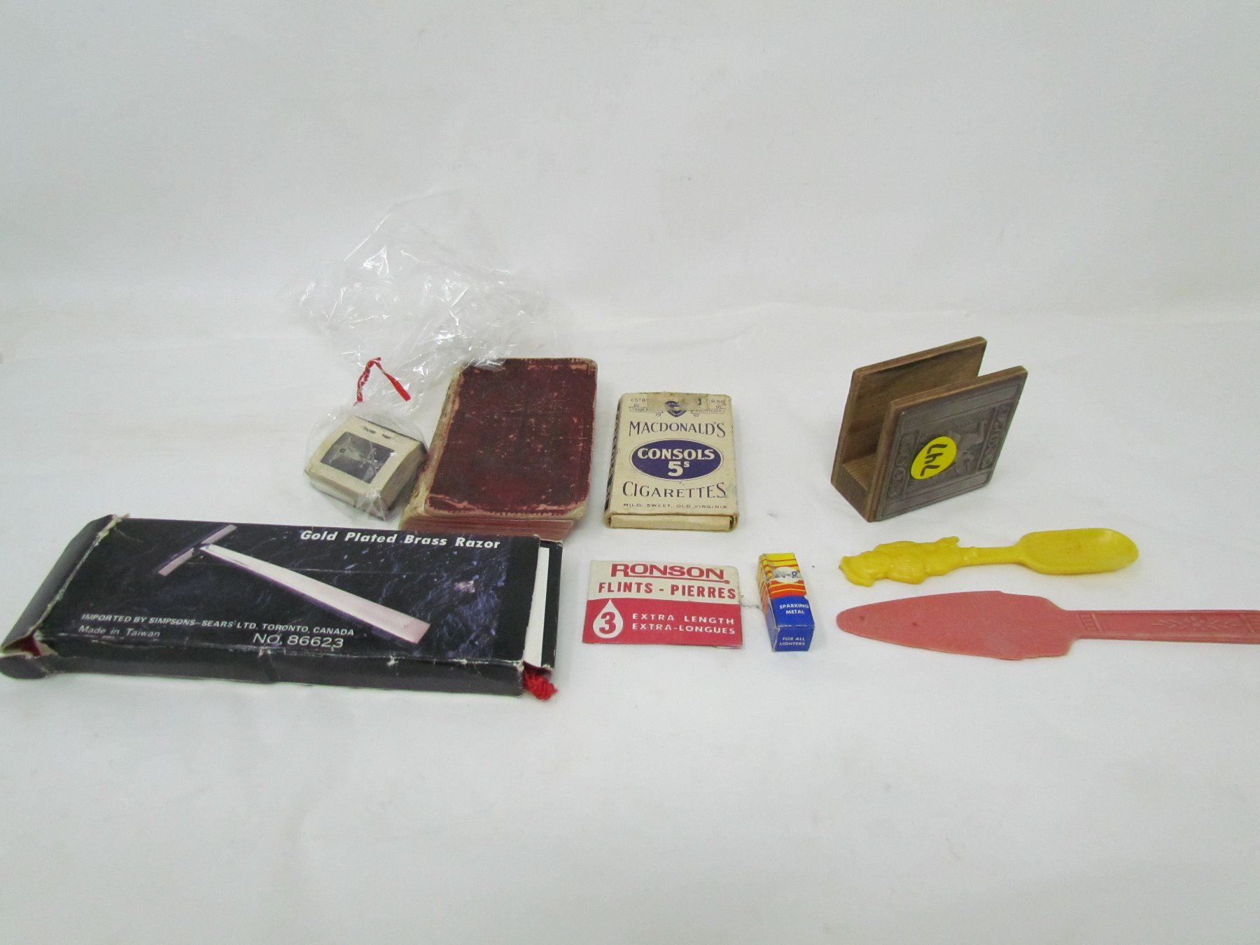 LOT OF ASSORTED SMALLS (RAZOR, MINI BOOK, CIGARETTES-CONSOL WITH 4 STILL IN PACK, ETC…)