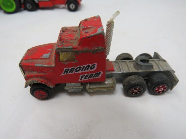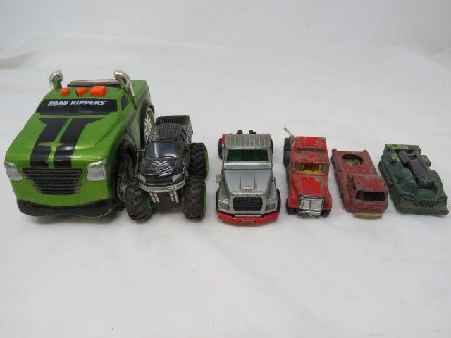 LOT OF ASSORTED TOY VEHICLES ( MONSTER TRUCK, ROAD RIPPER TRUCK, SUPER KING SEMI, FIRE ENGINE AND TANK)