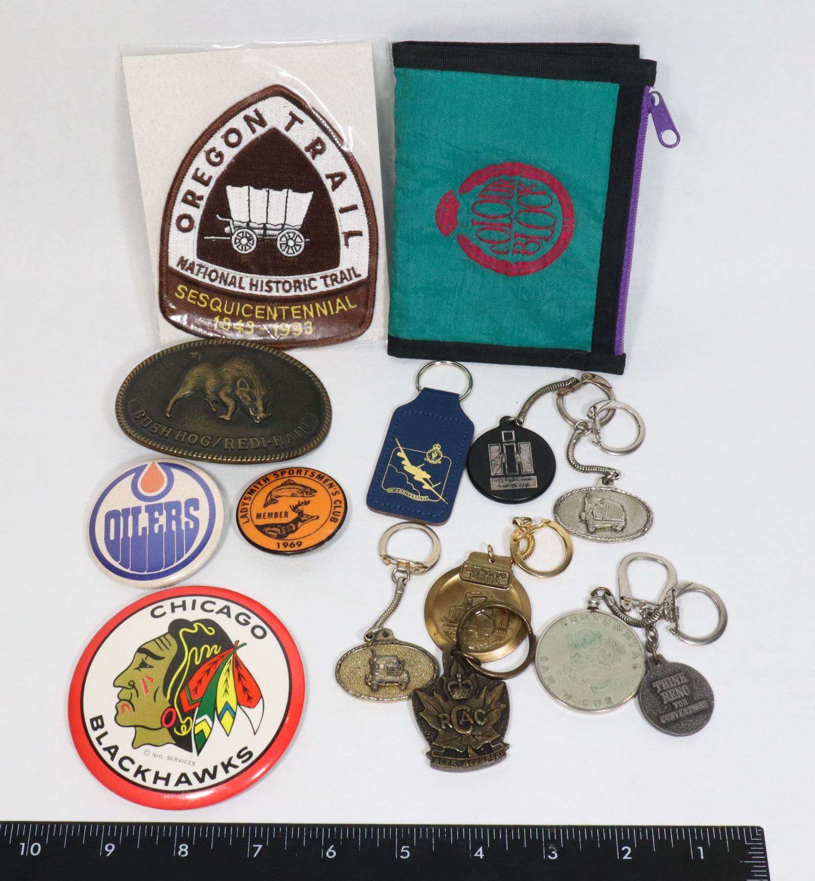 2 VINTAGE PINS AND BELT BUCKLE, LADYSMITH SPORTSMEN'S CLUB 1969 PIN, OILERS PIN AND BUSH HOG/ REDI-RAIN BELT BUCKLE AND VINTAGE COLOUR BLOCK WALLET, CHICAGO BLACK HAWKS PIN AND OREGIB HISTORIC TRAIL PATCH