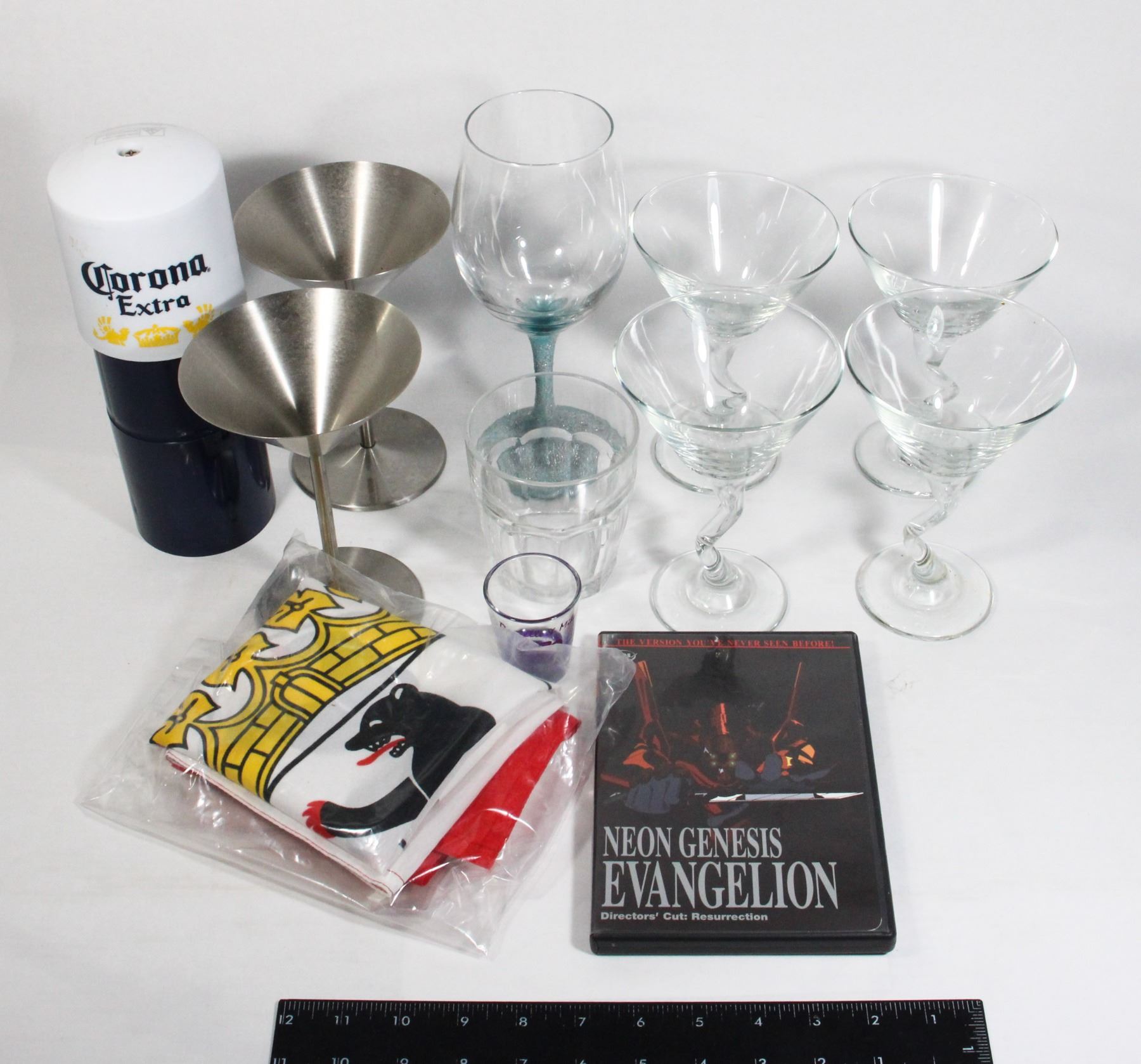 LOT OF BAR GLASSES, MARTINI, FLAG, AND MORE