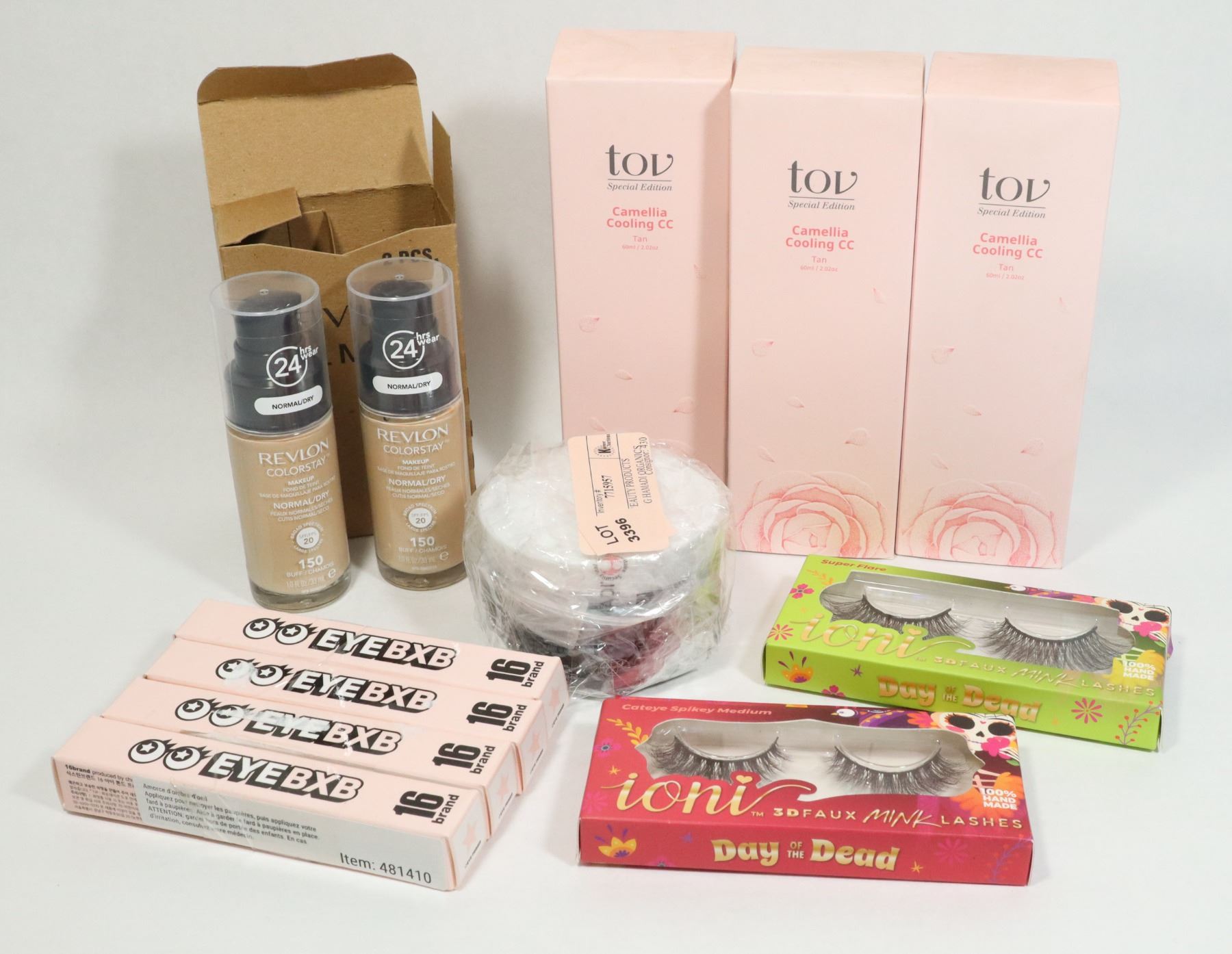 SHEA HAIR MASK 120ML, 3 BOTTLES OF TAN TOV AMELLIA COOLING CC EXP. 2021/02/28, 4 EYEBXB BOND PRIMER BRAND 16 AND 2 PACKS OF FAUX MINK EYE LASHES. UNCLAIMED