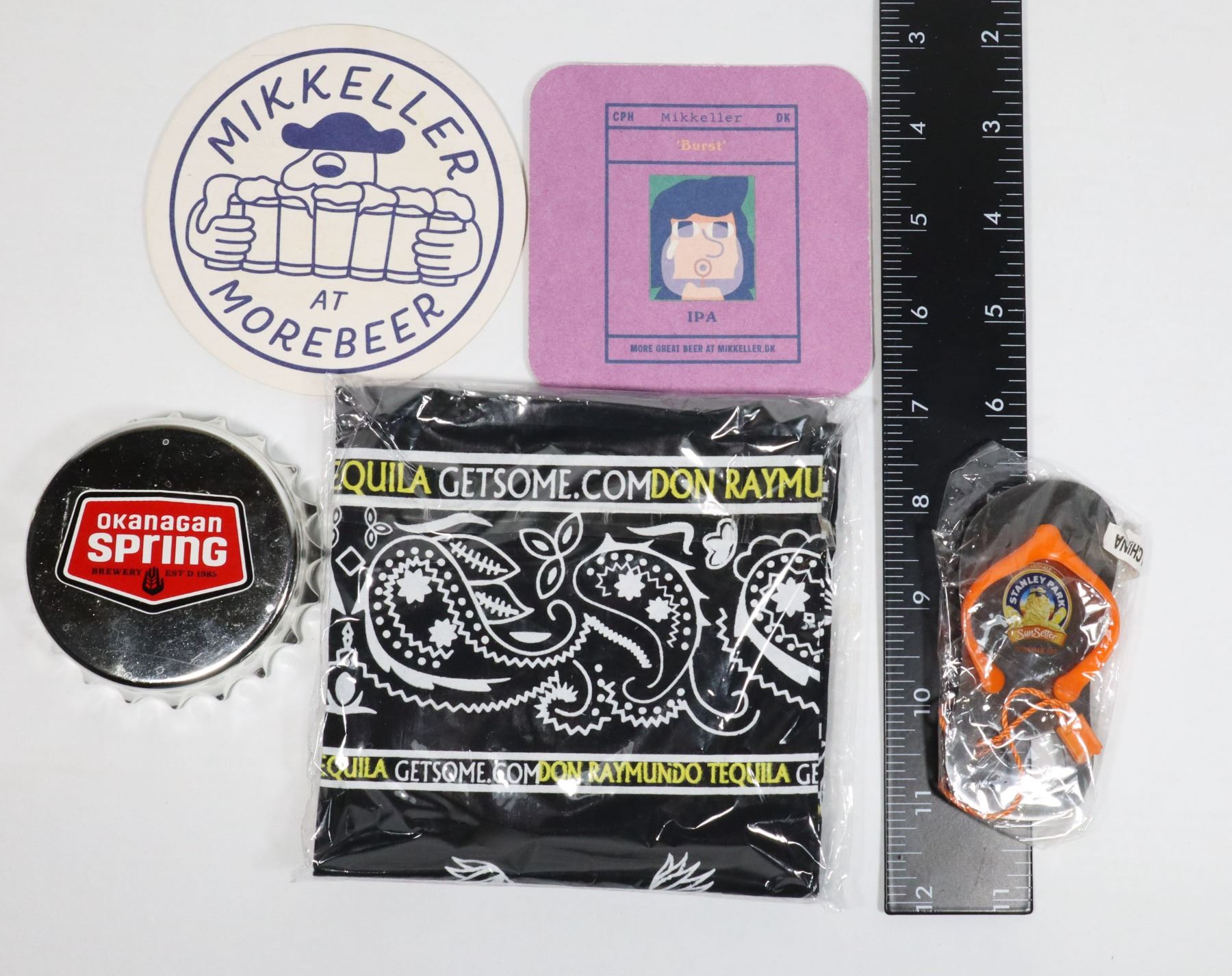 SUMMER ALE BOTTLE OPENER, OKANAGAN SPRING MAGNETIC BOTTLE OPENER, MIKE KELLER COASTERS, AND DON RAYMUNDO TEQUILA BANDANA.