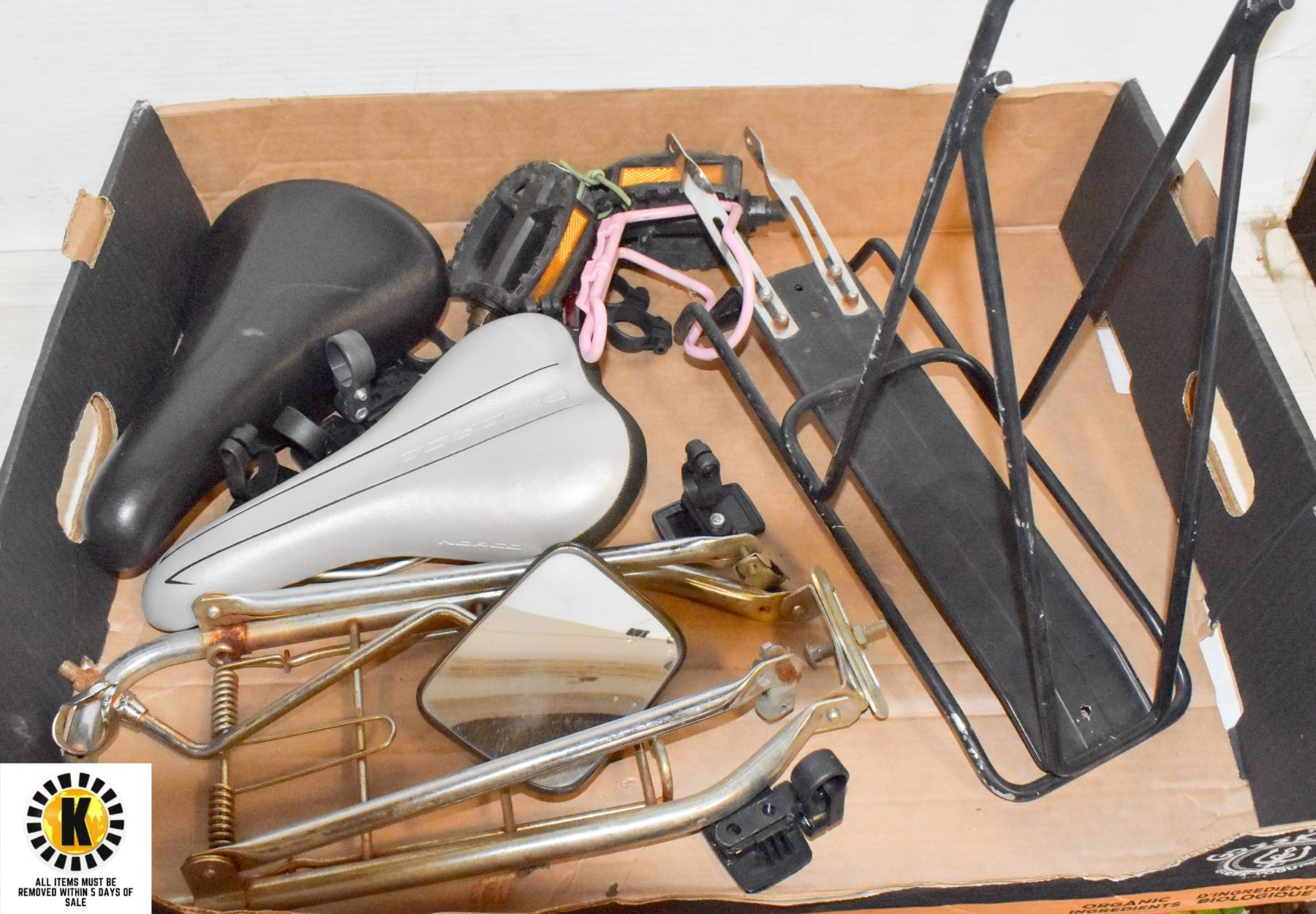 LOT OF BIKE PARTS, SEATS, RACKS, REFLECTORS ETC