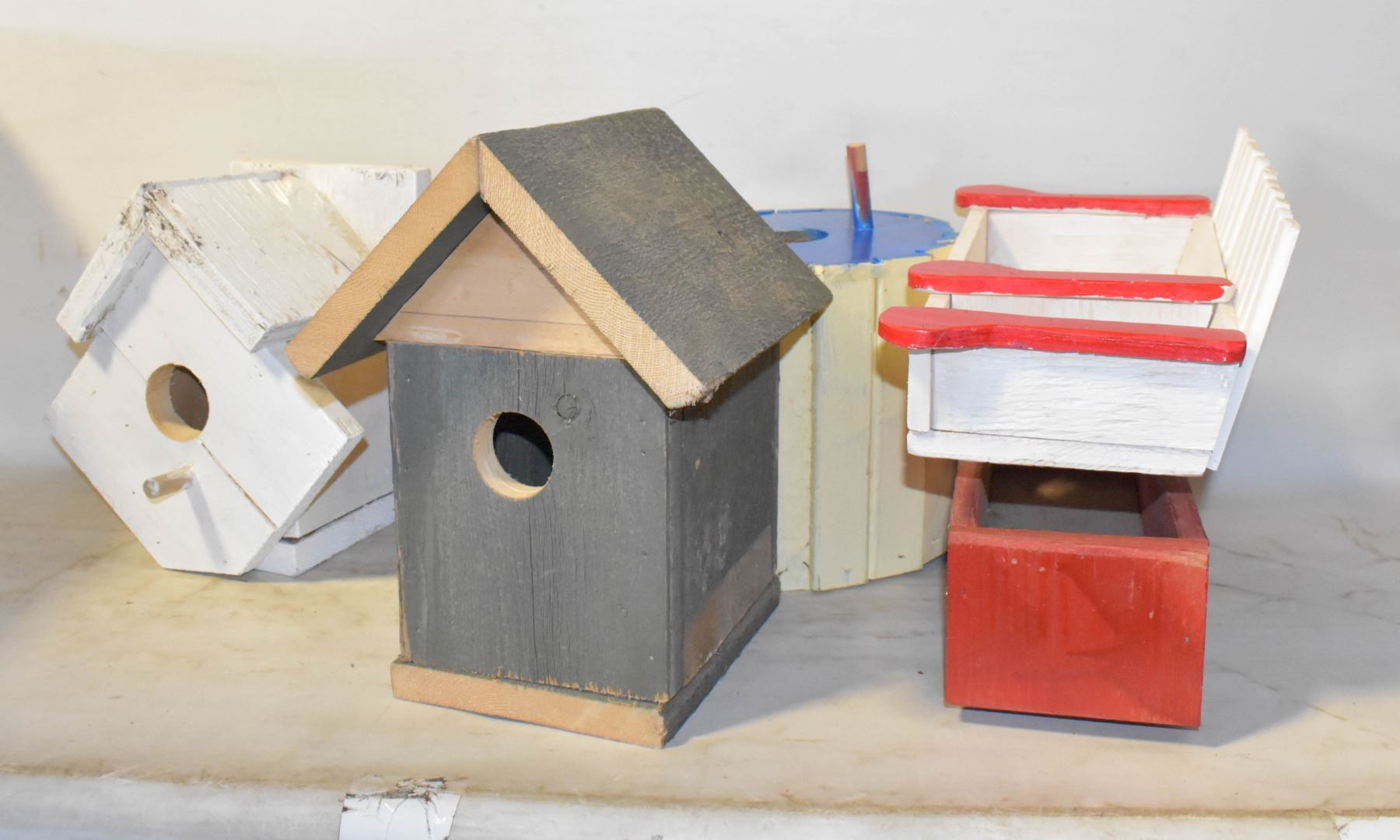 LOT OF BIRDHOUSES AND SQUIRREL FEEDERS