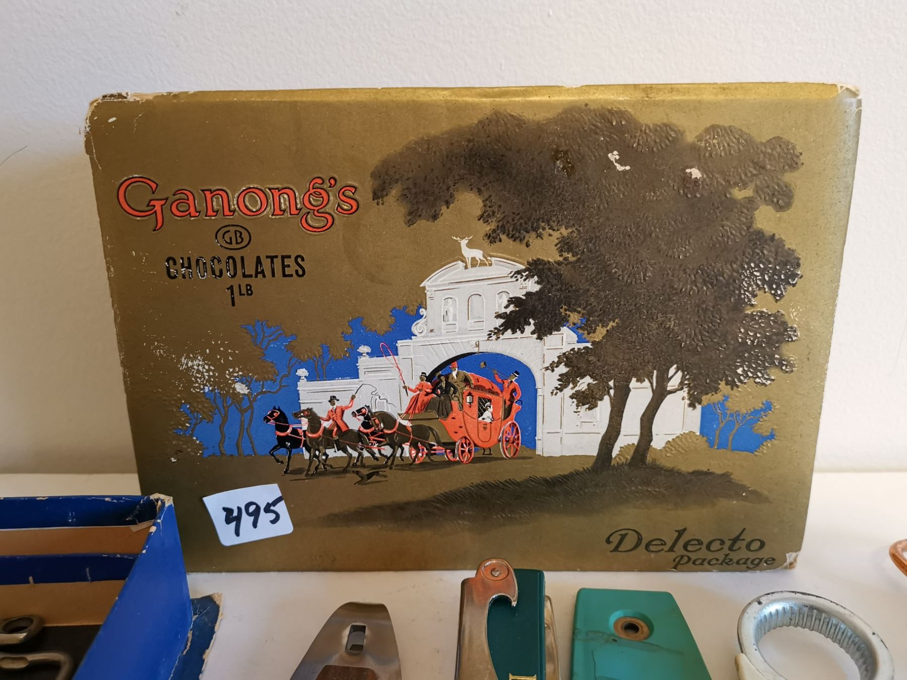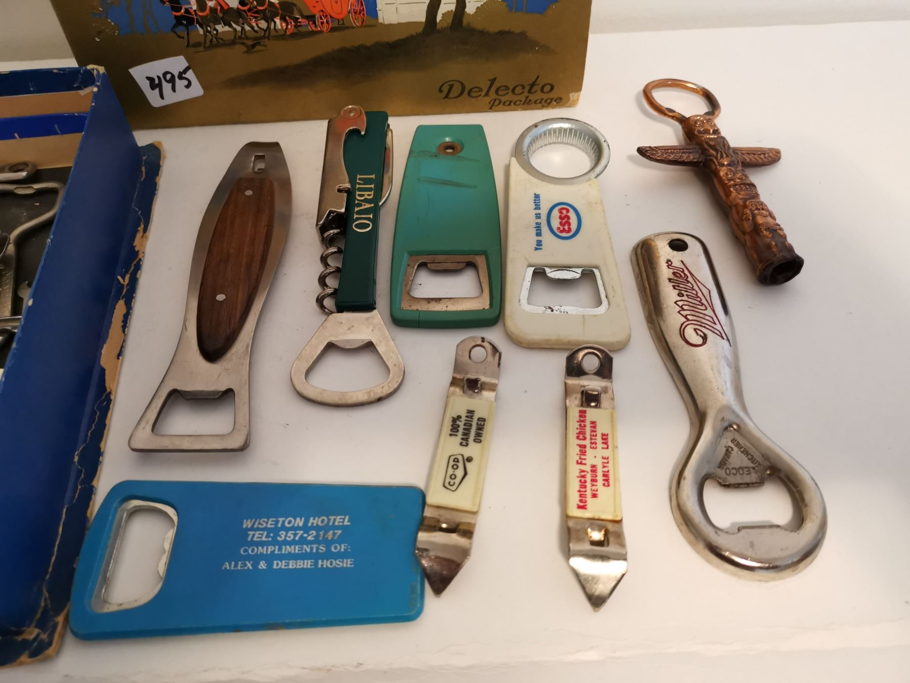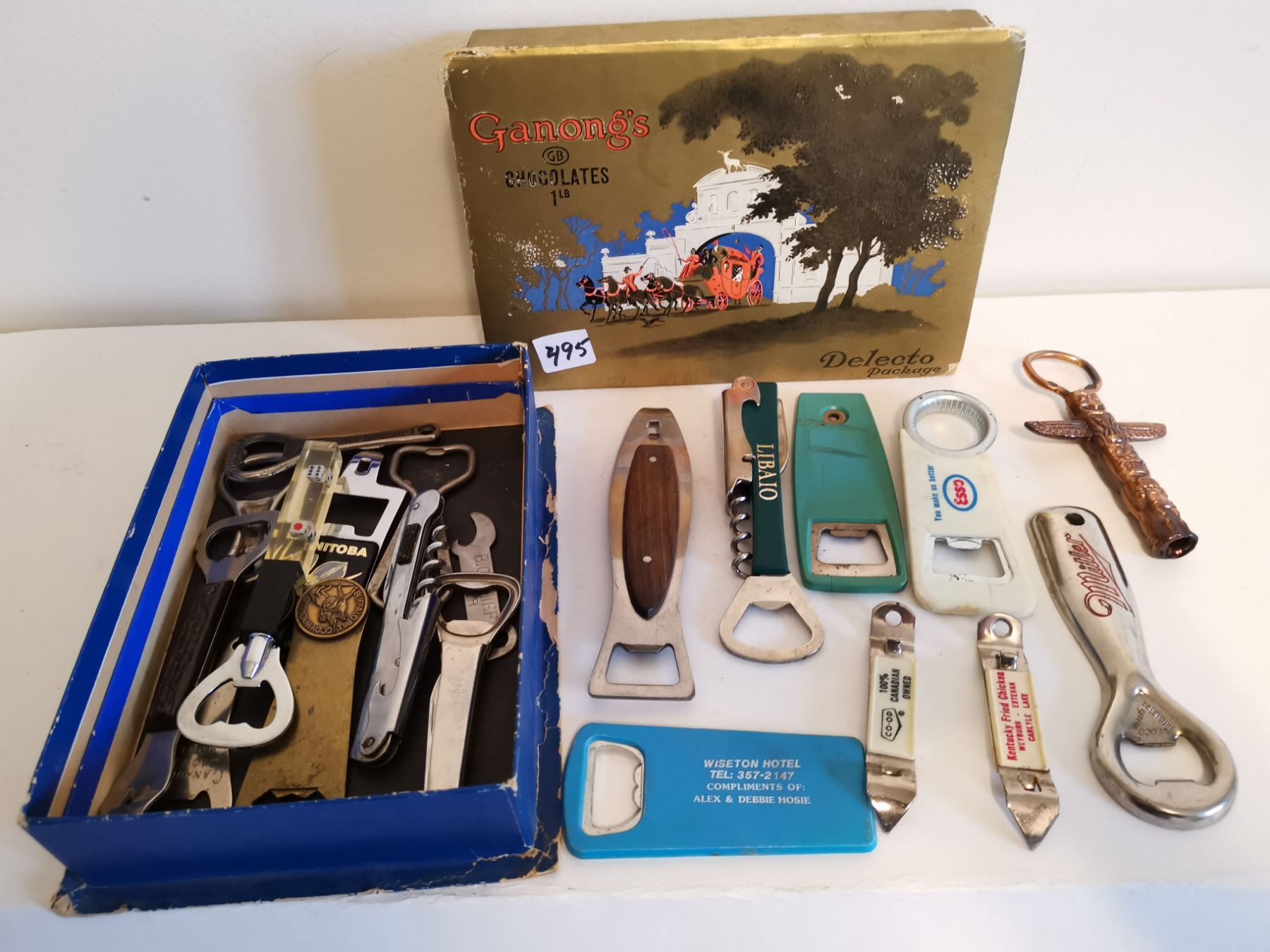 LOT OF BOTTLE OPENERS WITH VINTAGE CHOCOLATES BOX