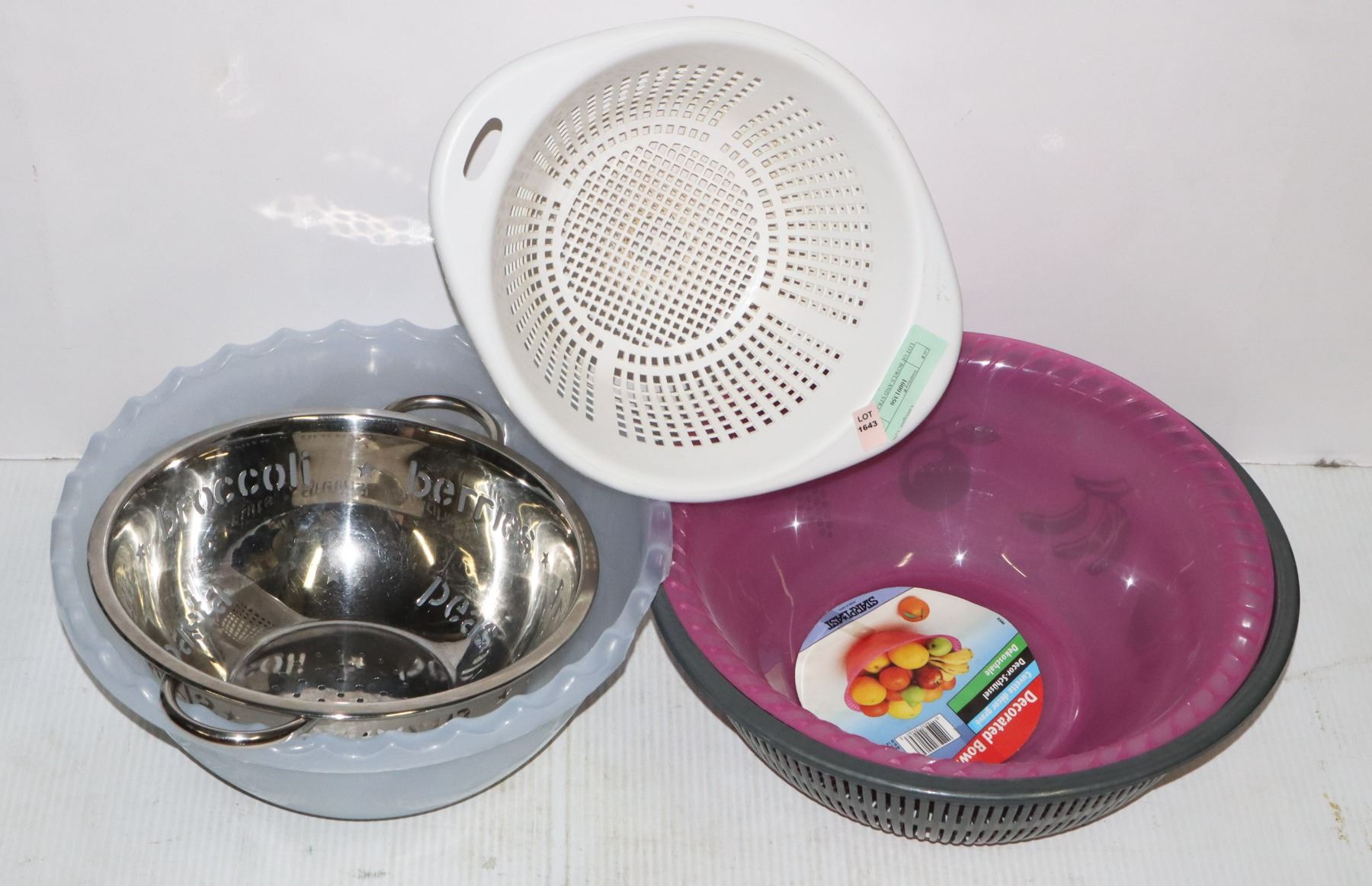 1 STRAINER IS STAINLESS STEEL. ONE BOWL HAS A LARGE CHIP ON RIM