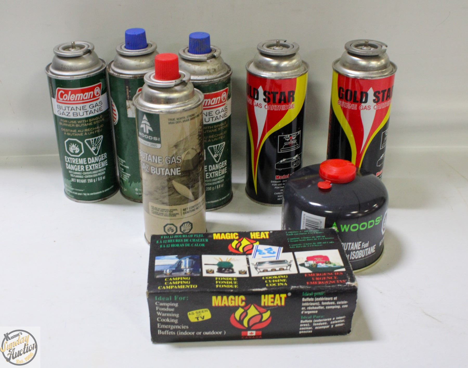 LOT OF BUTANE REFILL & 2 CANS OF HEAT