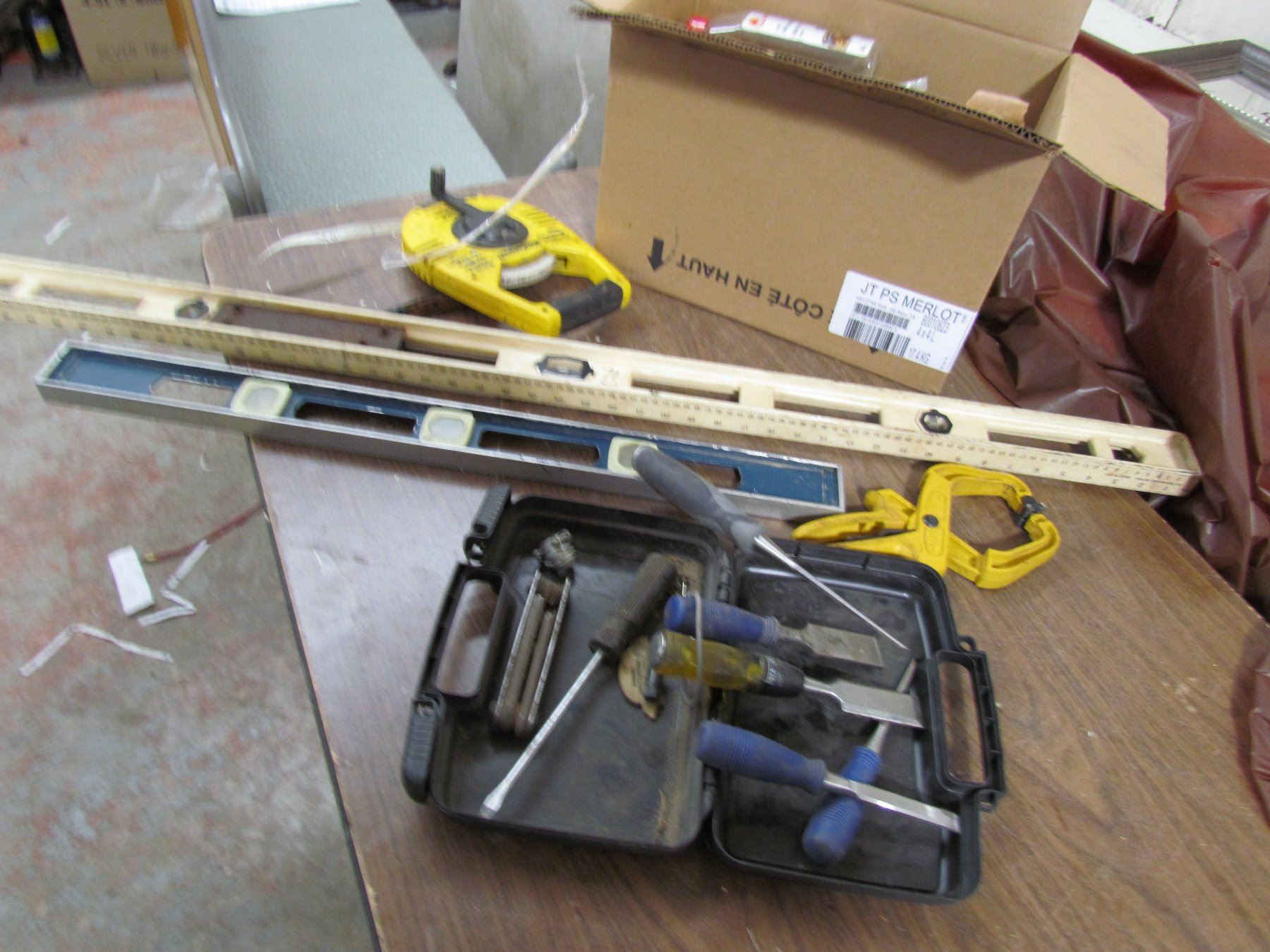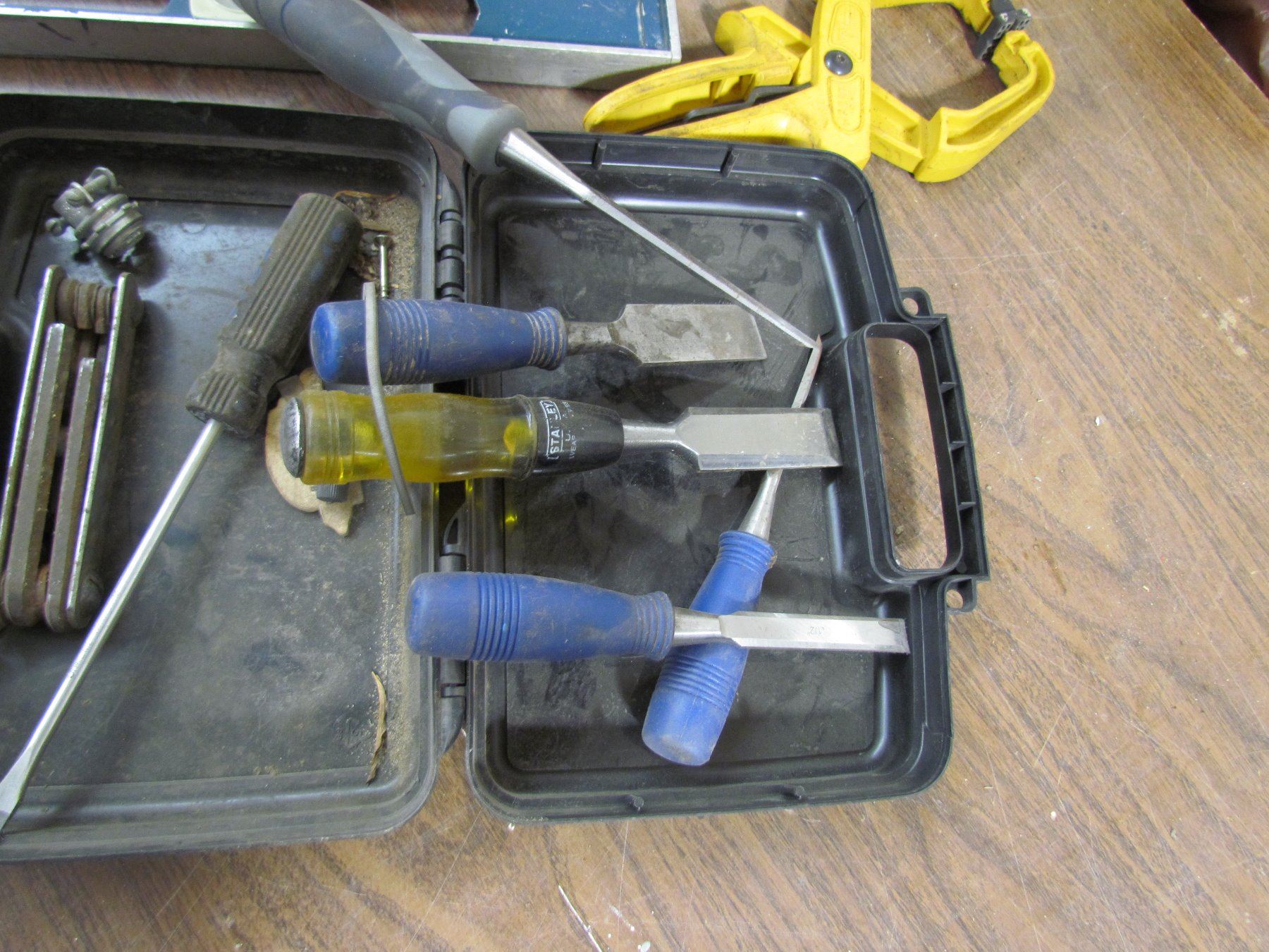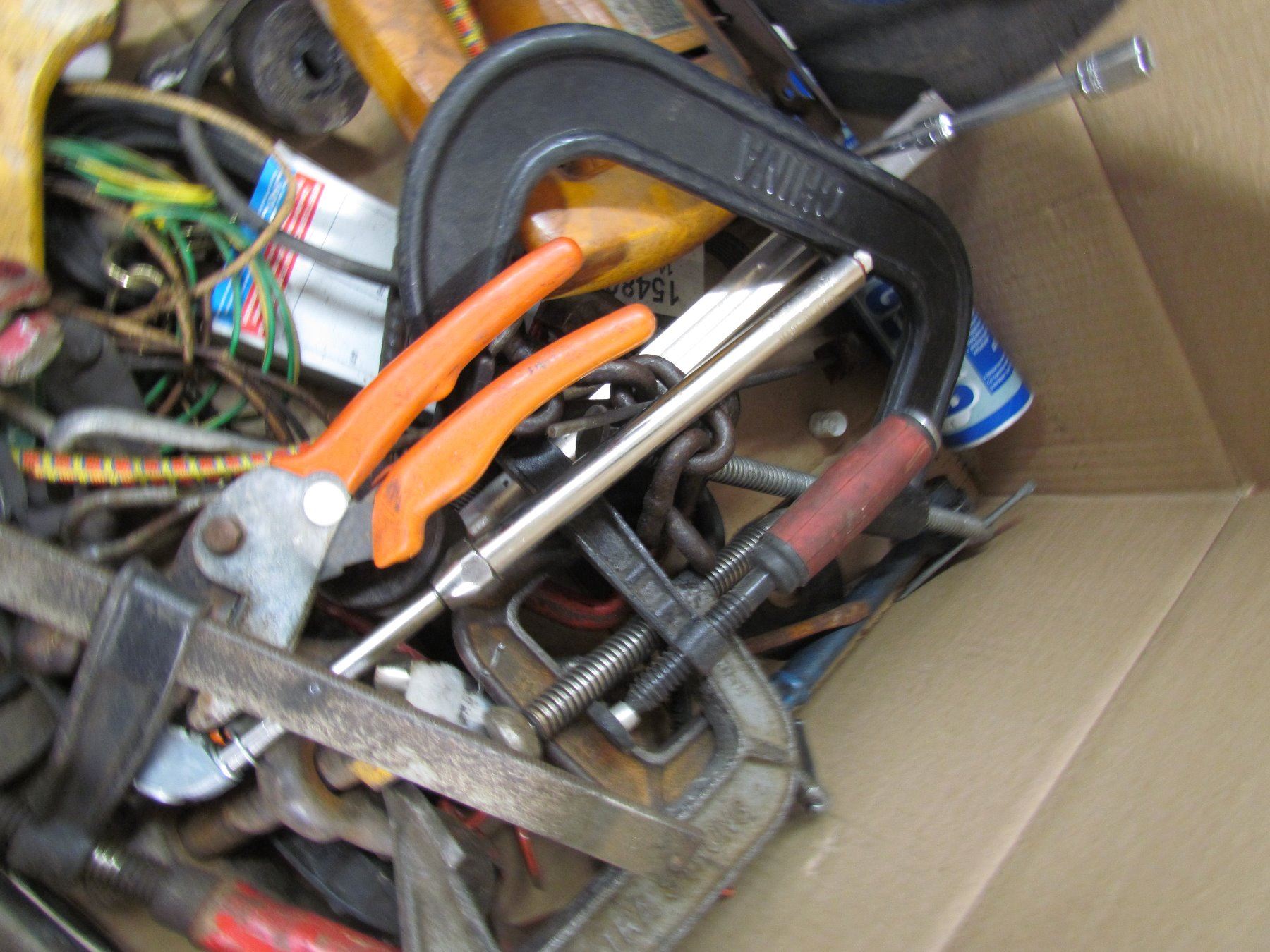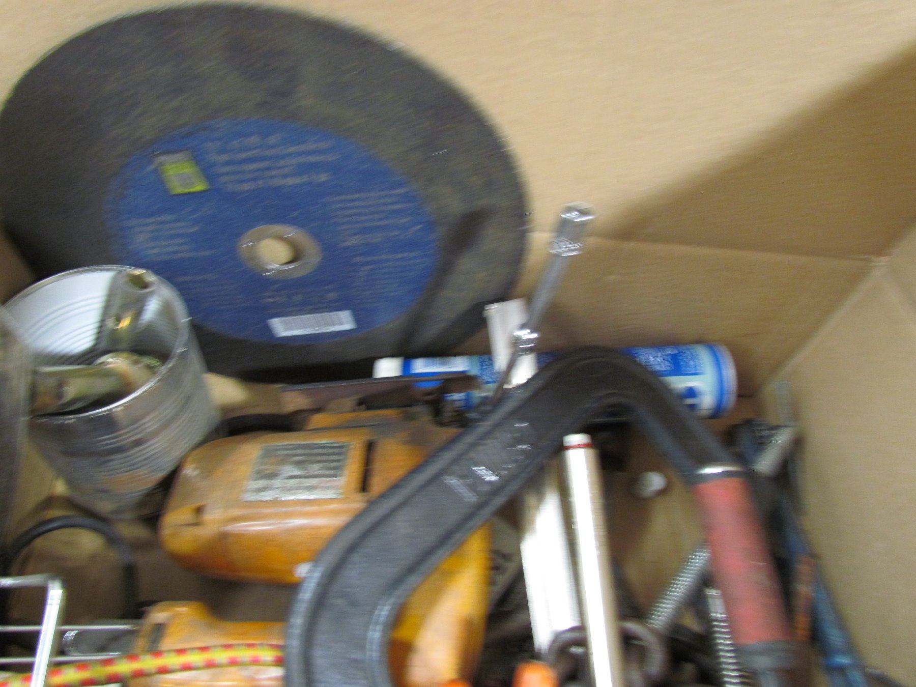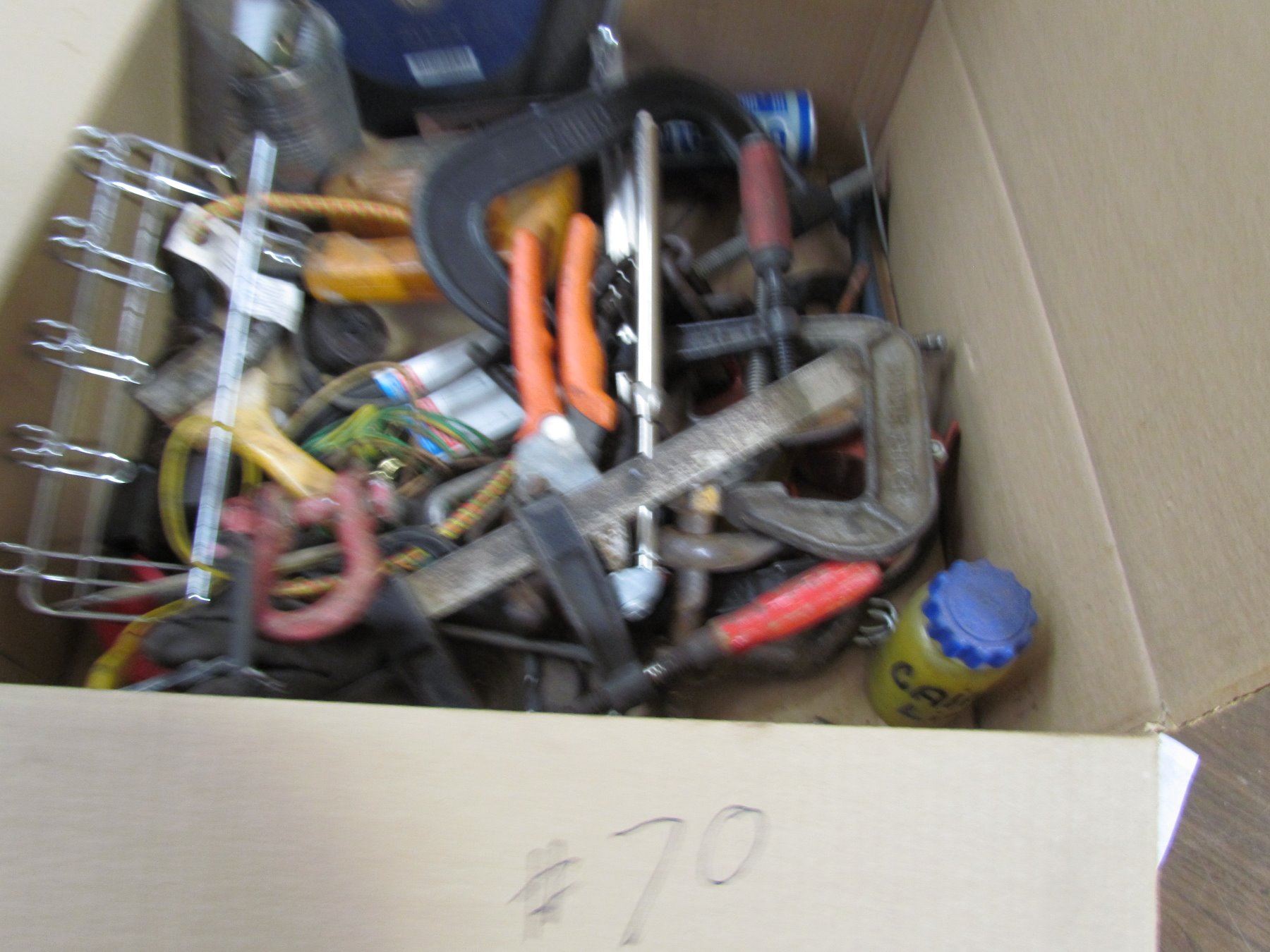 LOT OF C-CLAMPS, CUT OFF BLADE, CLEVISES, MISC. TOOLS