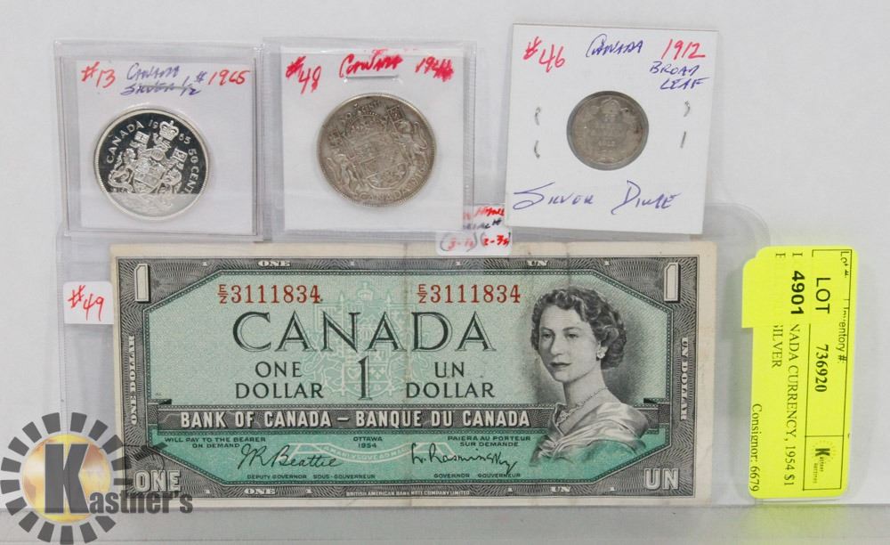 BROAD LEAF DIME, 1946, 1965 HALF DOLLARS. CURRENCY
