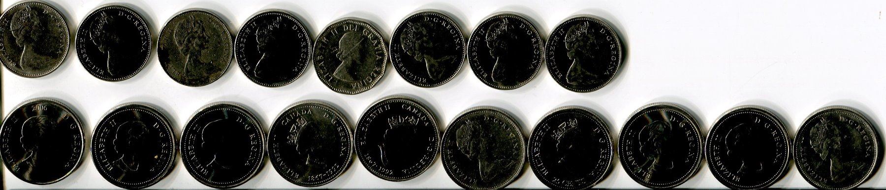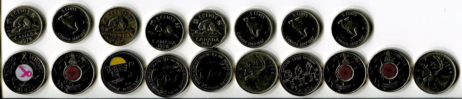 LOT OF CANADIAN COINS (10 -25 CENT COINS, 8-5 CENT COINS) *ASSORTED DATES 1961 AND ON*