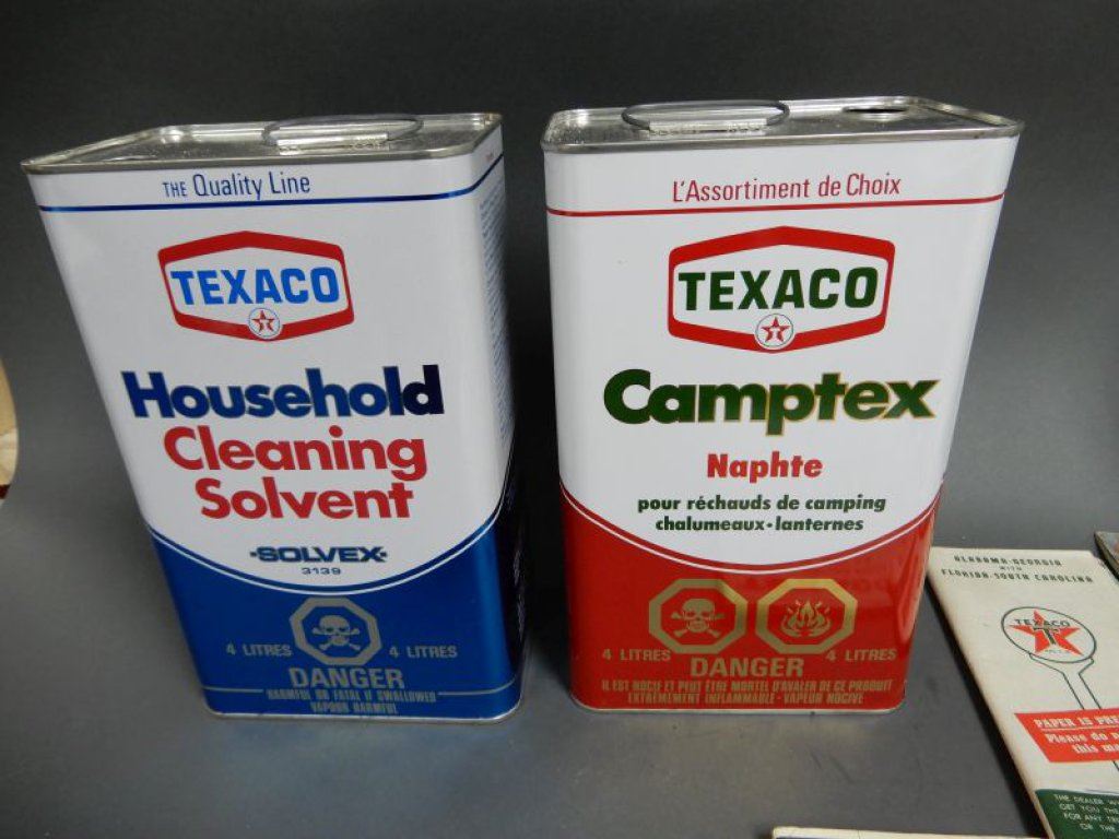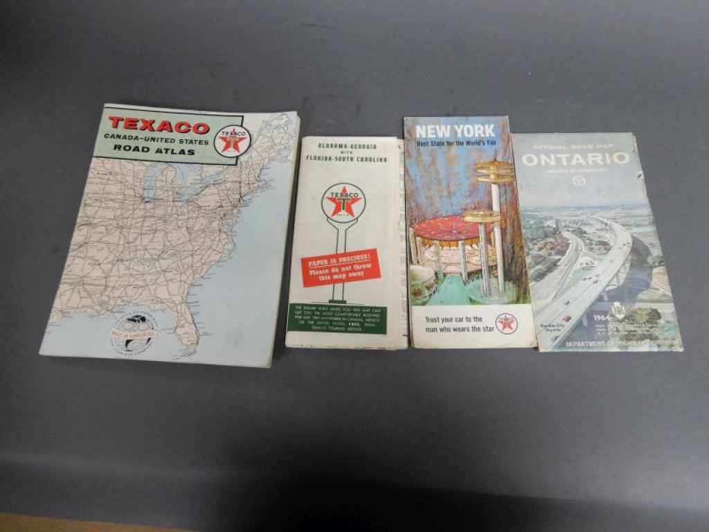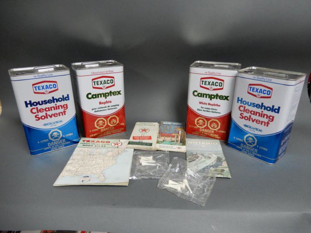 LOT OF CANS & TEXACO MAPS 4 NEW 4 LITRE TEXACO CANS- NO CAPS- 3 TEXACO MAPS- ONE 1964 ONTARIO - GOLF TEES LOCATION: LOWER RIGHT
