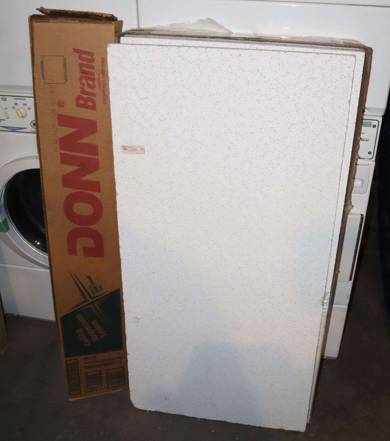 INCLUDES CASE OF EIGHT 2' X 4' TILES, AND OPEN BOX OF CEILING SUSPENSION SYSTEM