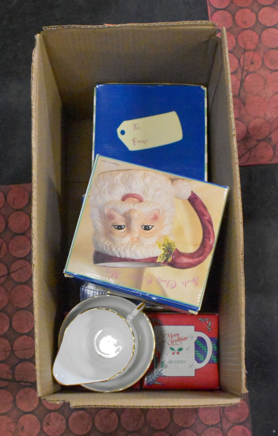 AND SUGAR BOWL, 3 BOXED TOBY JUG NOVELTY JUGS AND 2 BOXED CHRISTMAS MUGS.