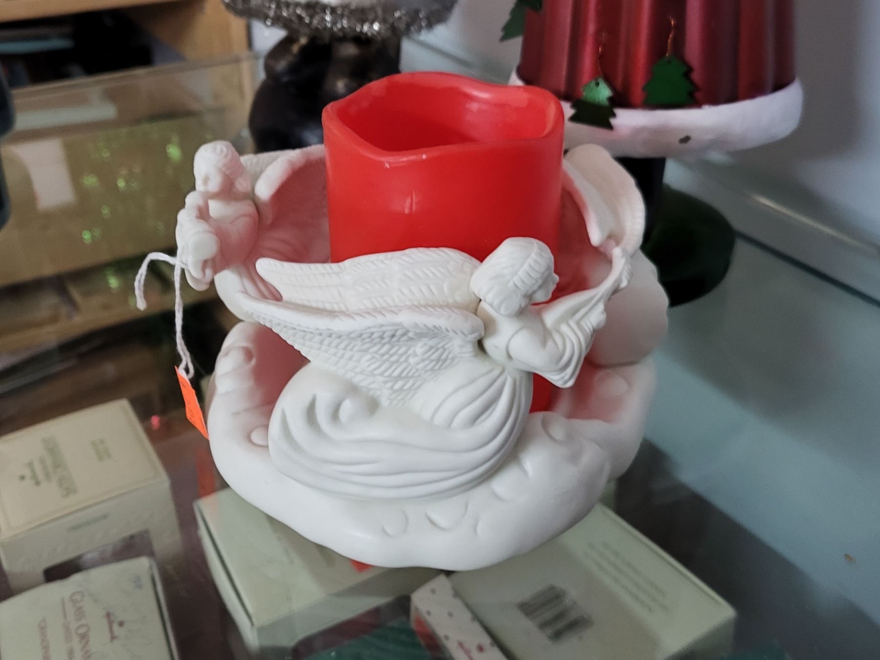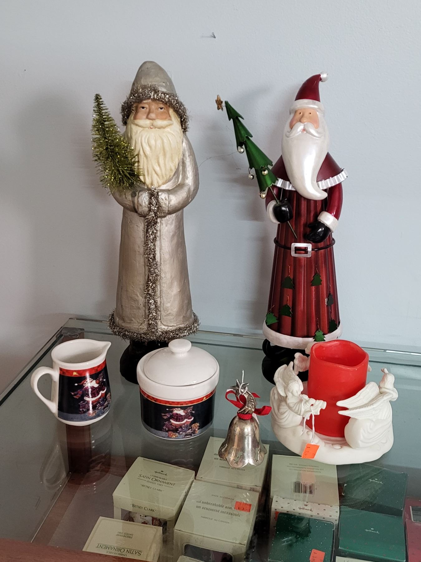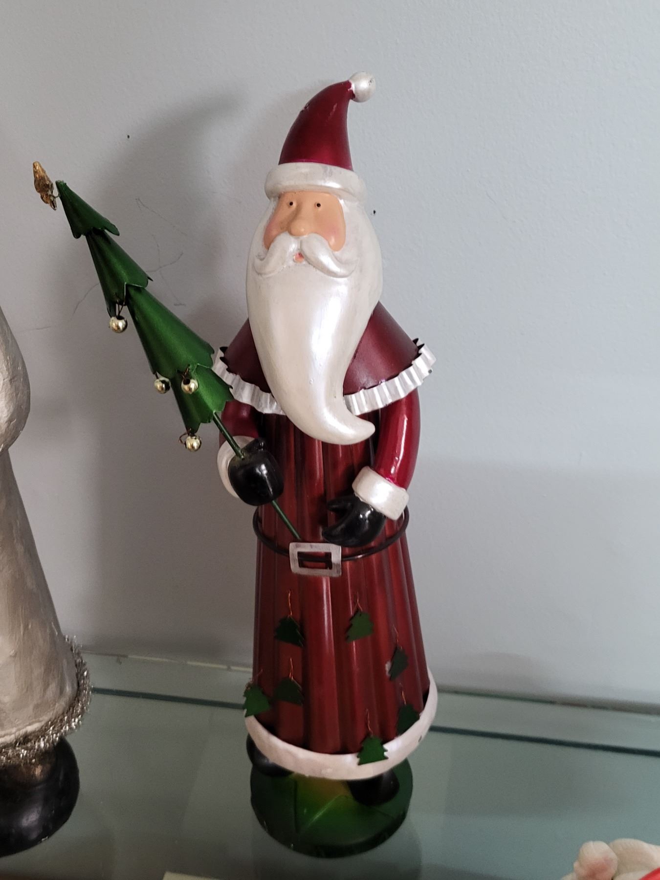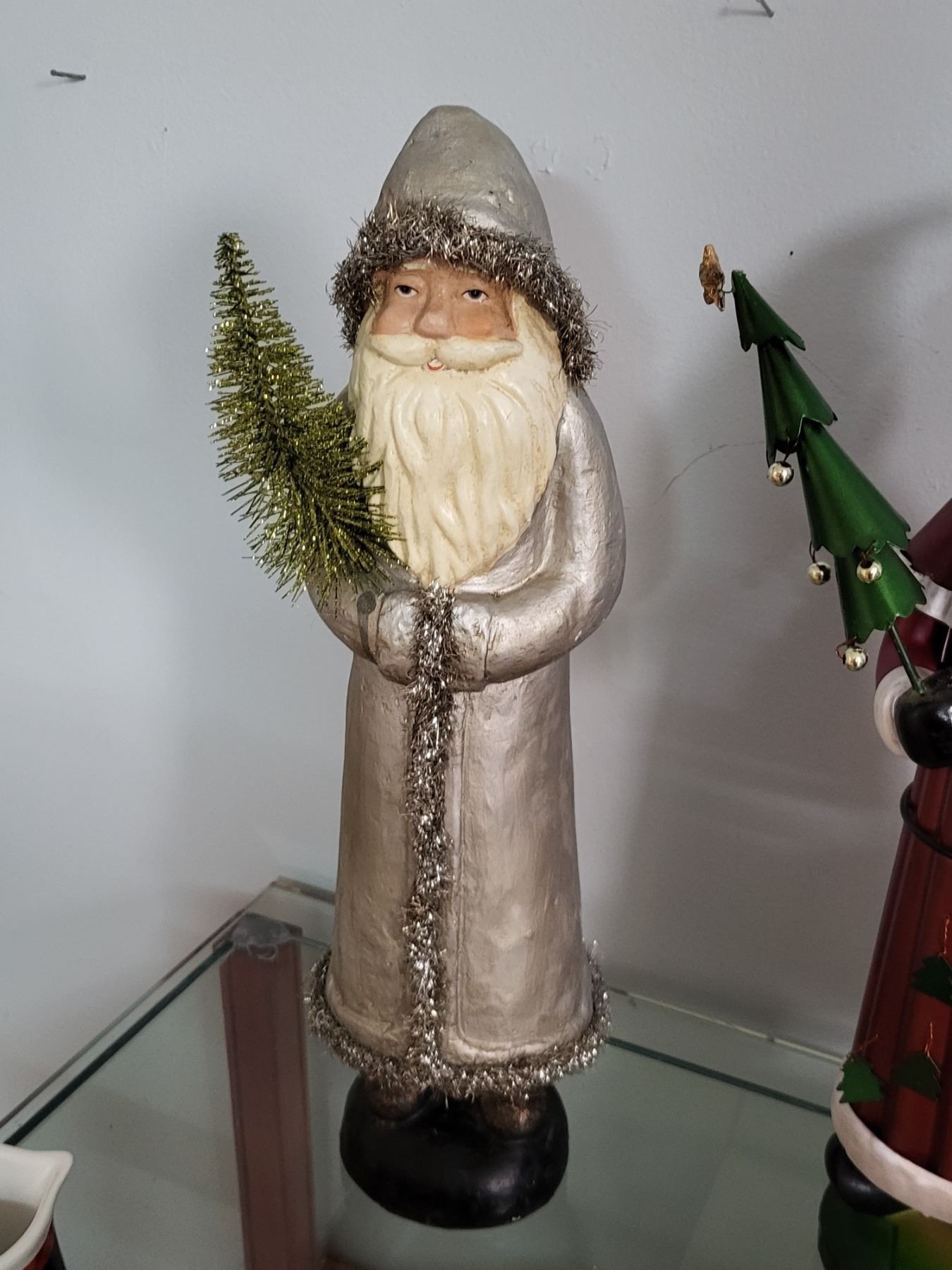 LOT OF CHRISTMAS ITEMS LOT 4. SILVER SANTA IS HEAVY AND IS 17.5" TALL. RED SANTA IS HEAVY AND IS 17" TALL