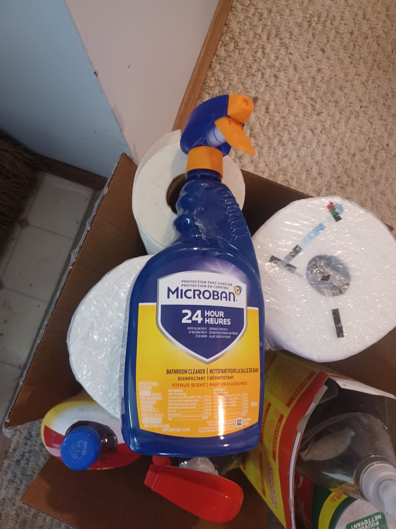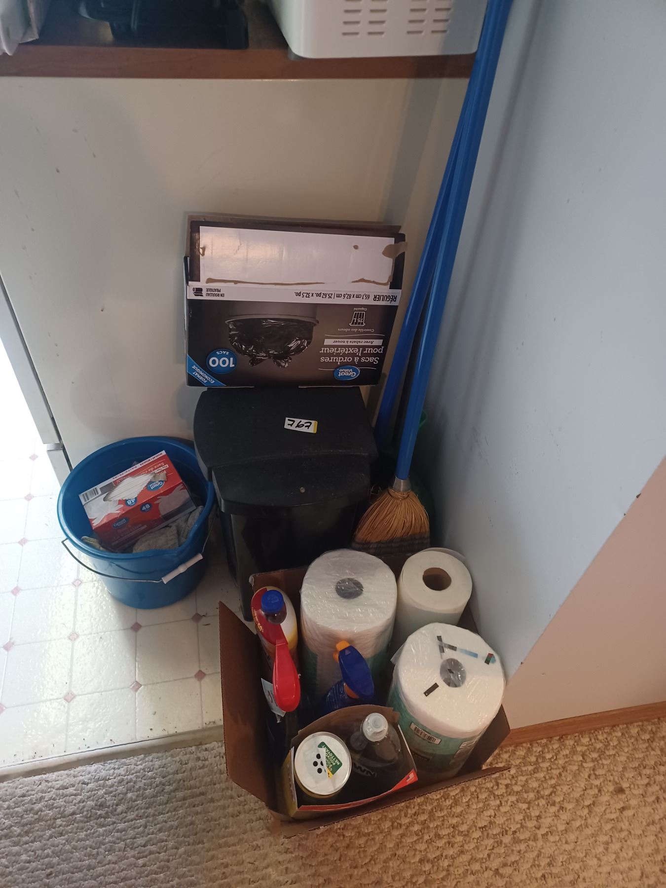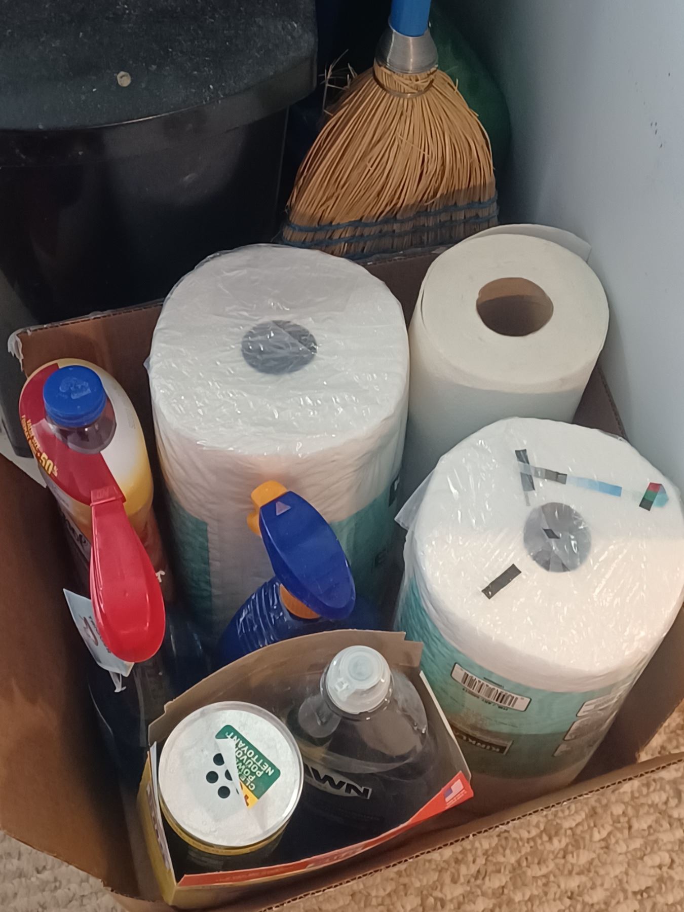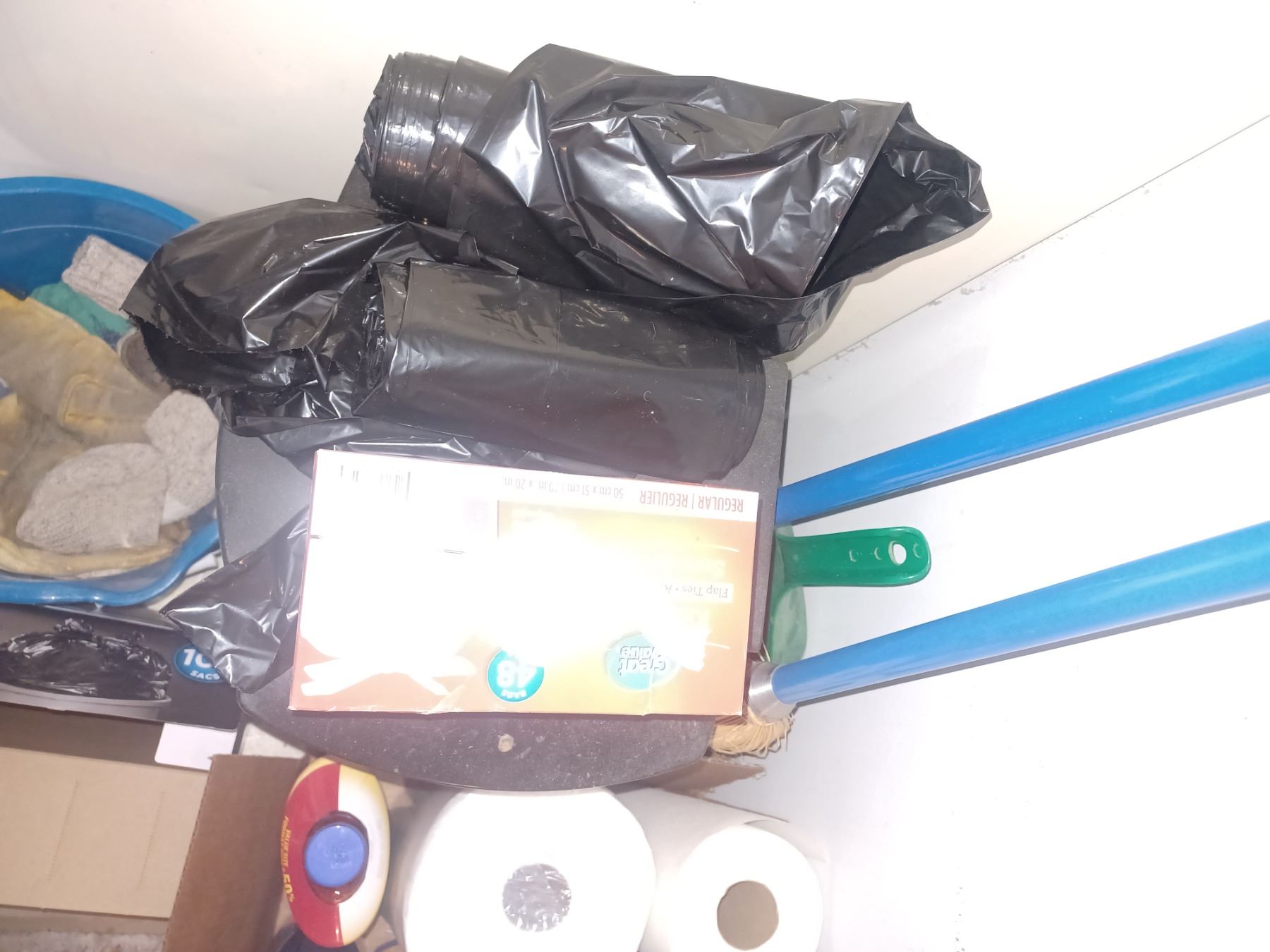 LOT OF CLEANING SUPPLIES, GARBAGE BAGS, PAPER TOWLS, CLEANER ECT