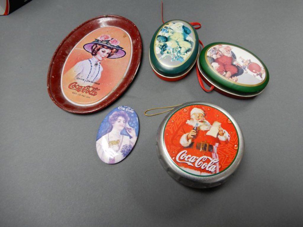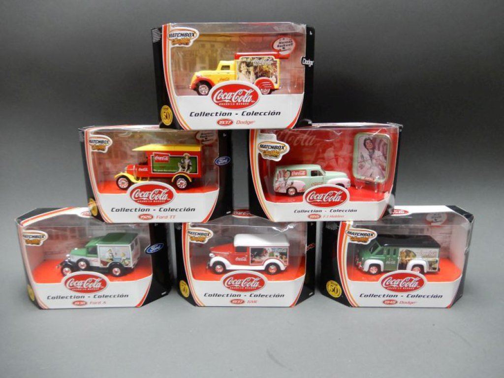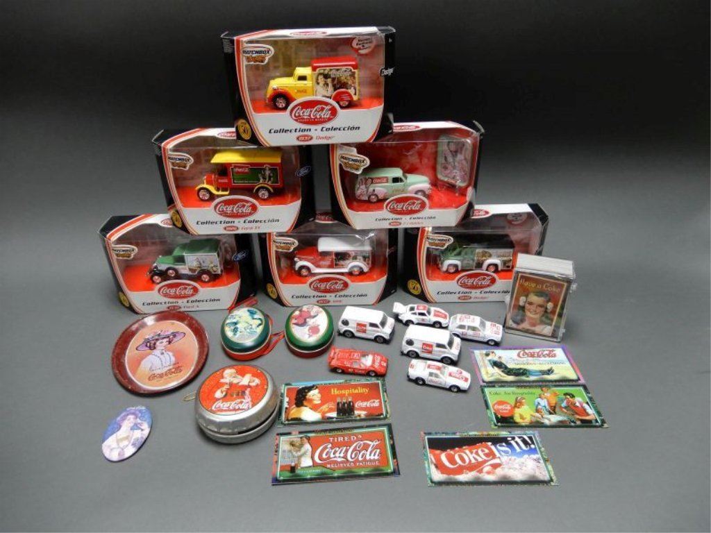 LOT OF COCA-COLA COLLECTIBLES 6 MATCHBOX DELIVERY TRUCKS/ BOX'S HARTOY MINI'S CARDS TRAYS & TINS LOCATION: LOWER RIGHT