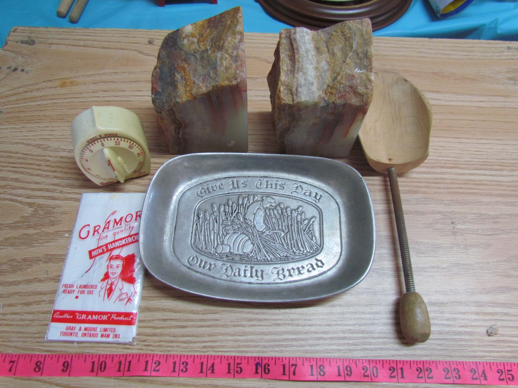LOT OF COLLECTABLES (ONYX BOOK ENDS, SILVER TRAY, ETC.)