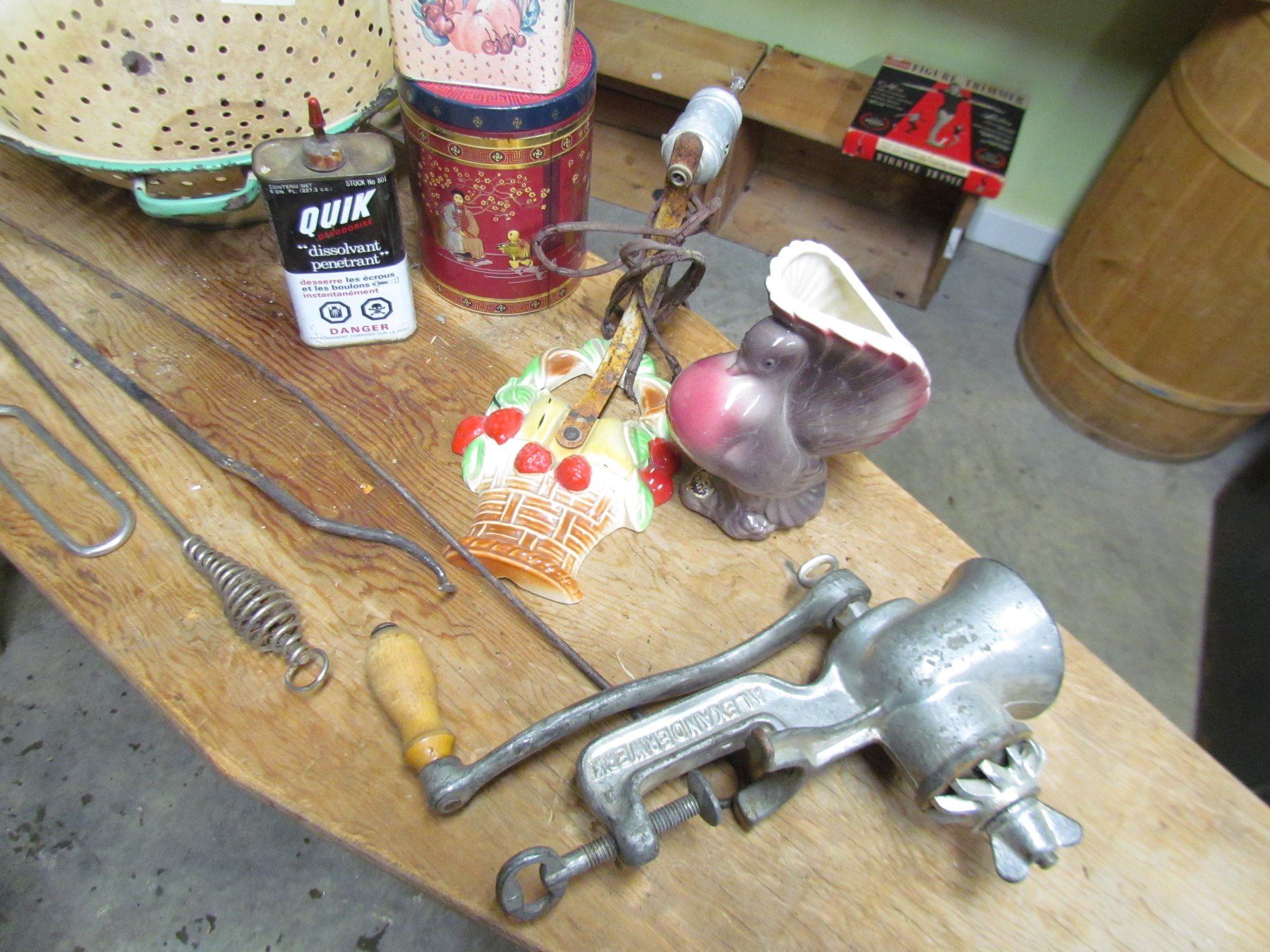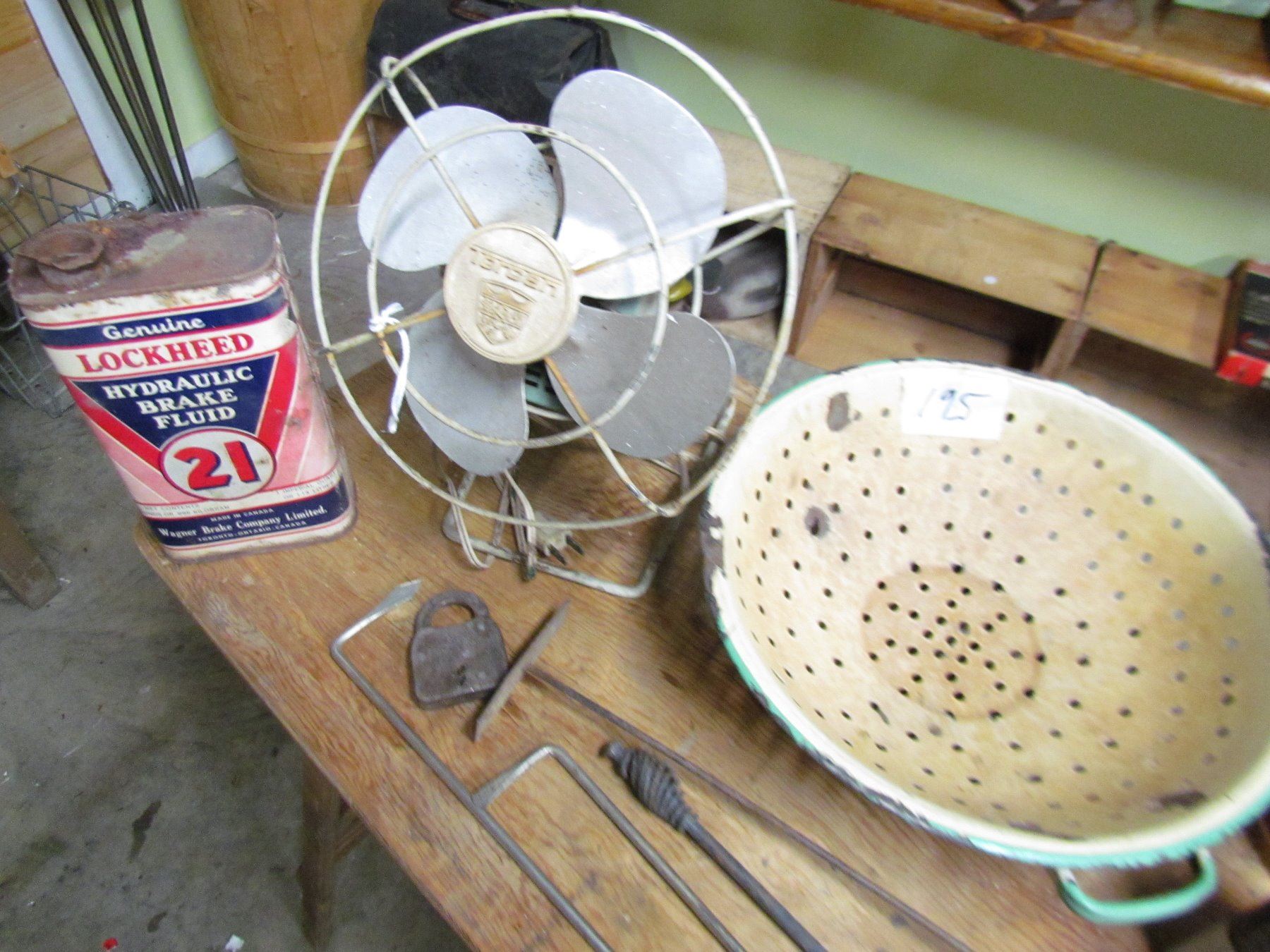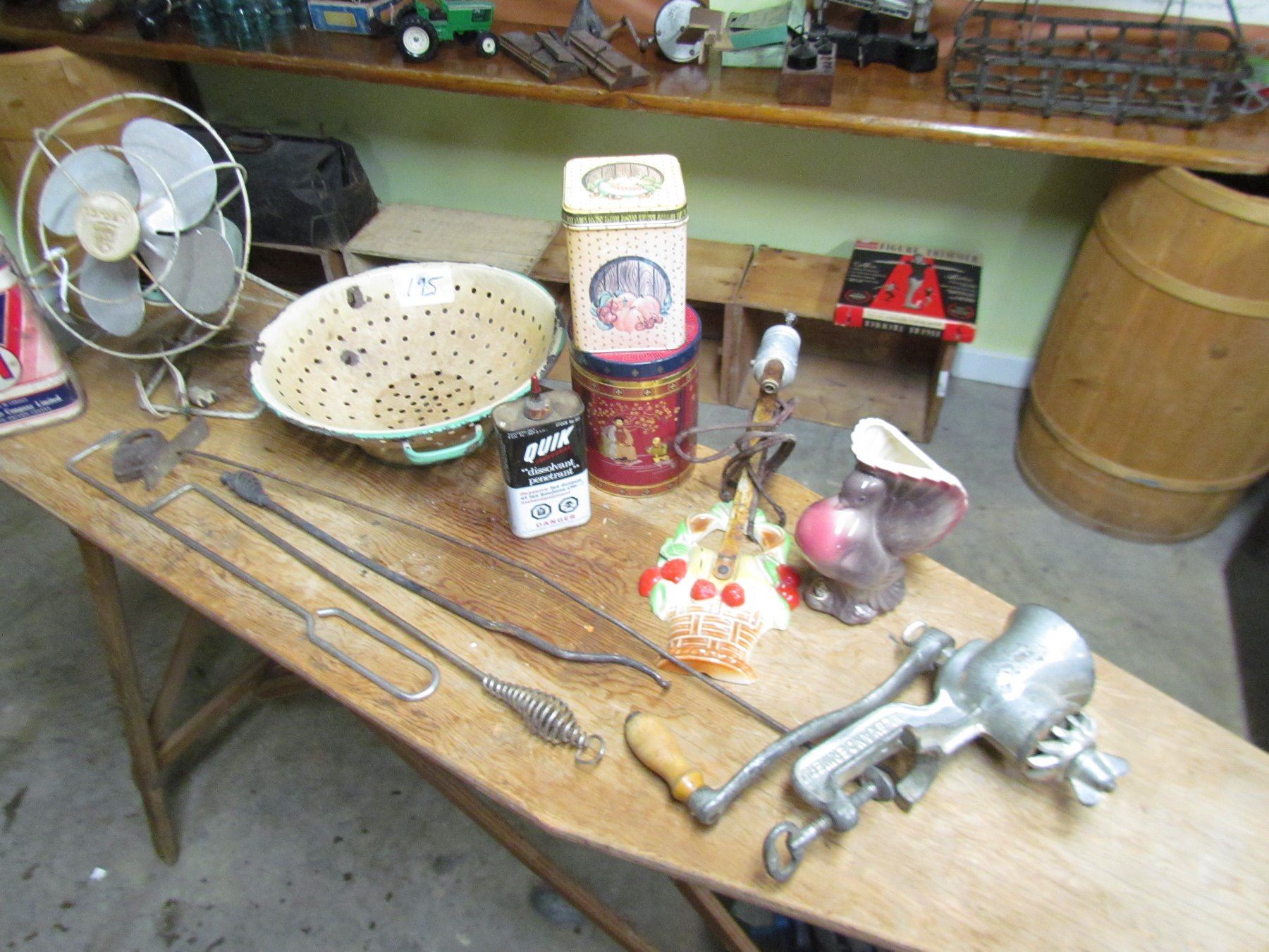 LOT OF COLLECTIBLES (FAN, TINS, GRINDER, ETC)