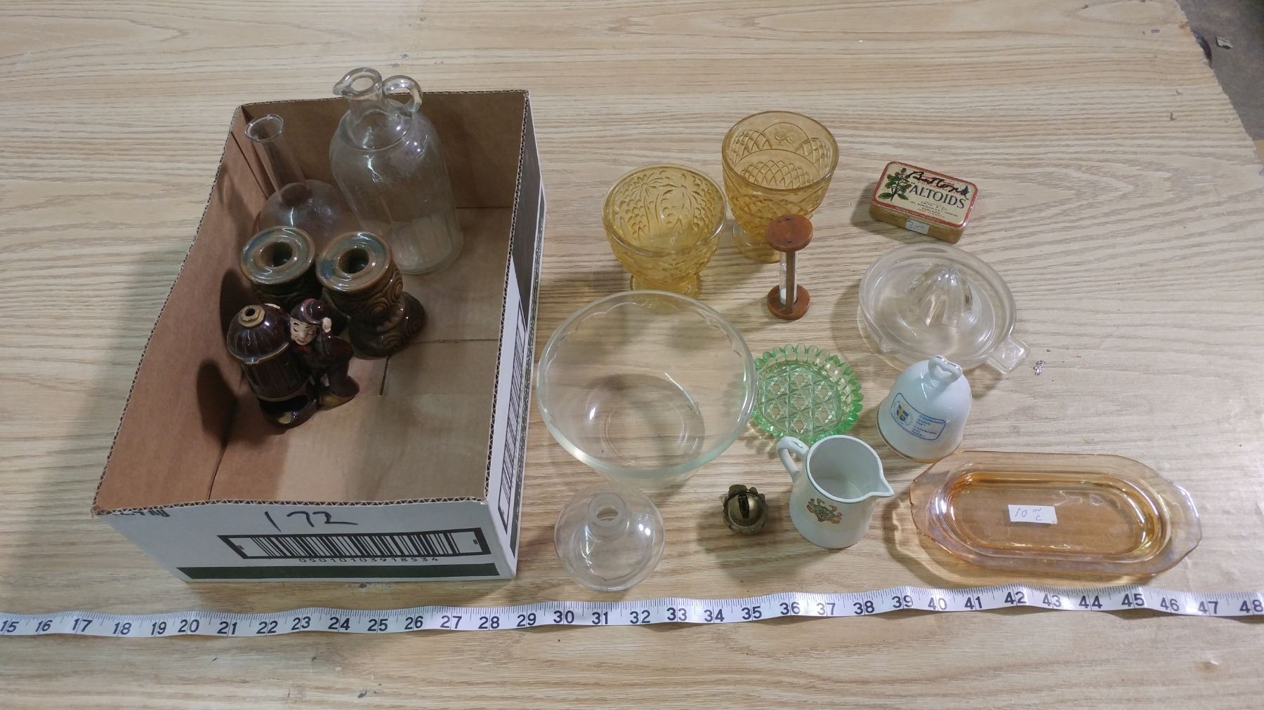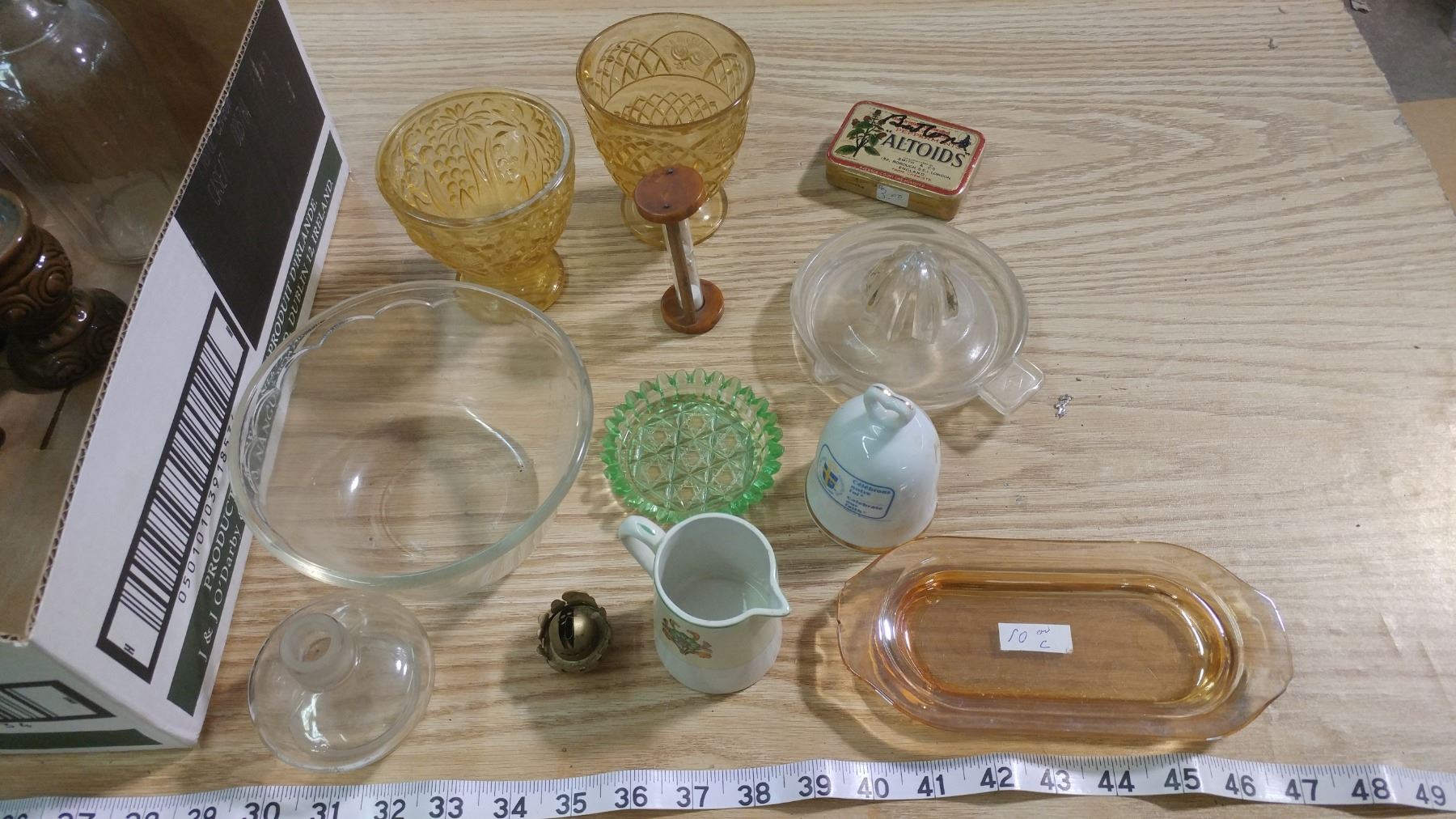 LOT OF COLLECTIBLES (JUICER, ALTOIDS TIN, BELL, ETC.)