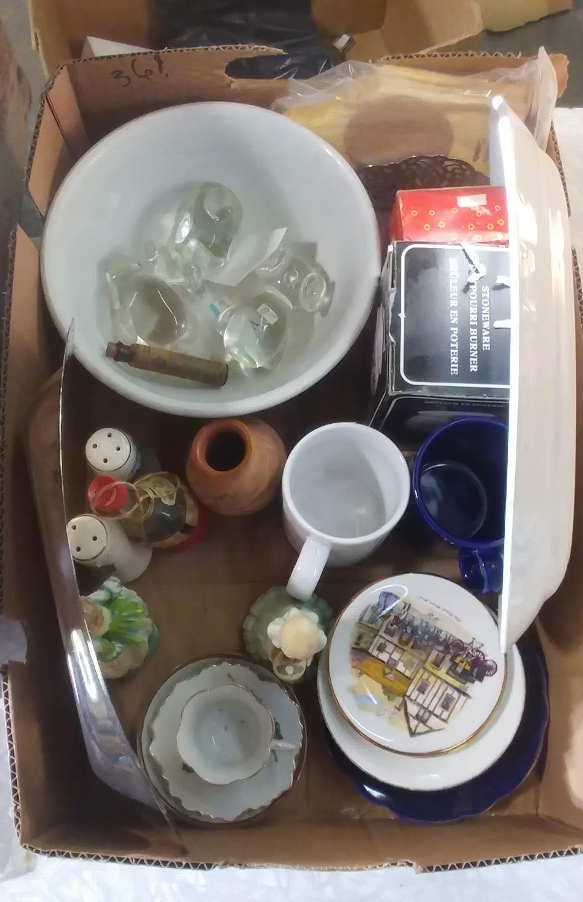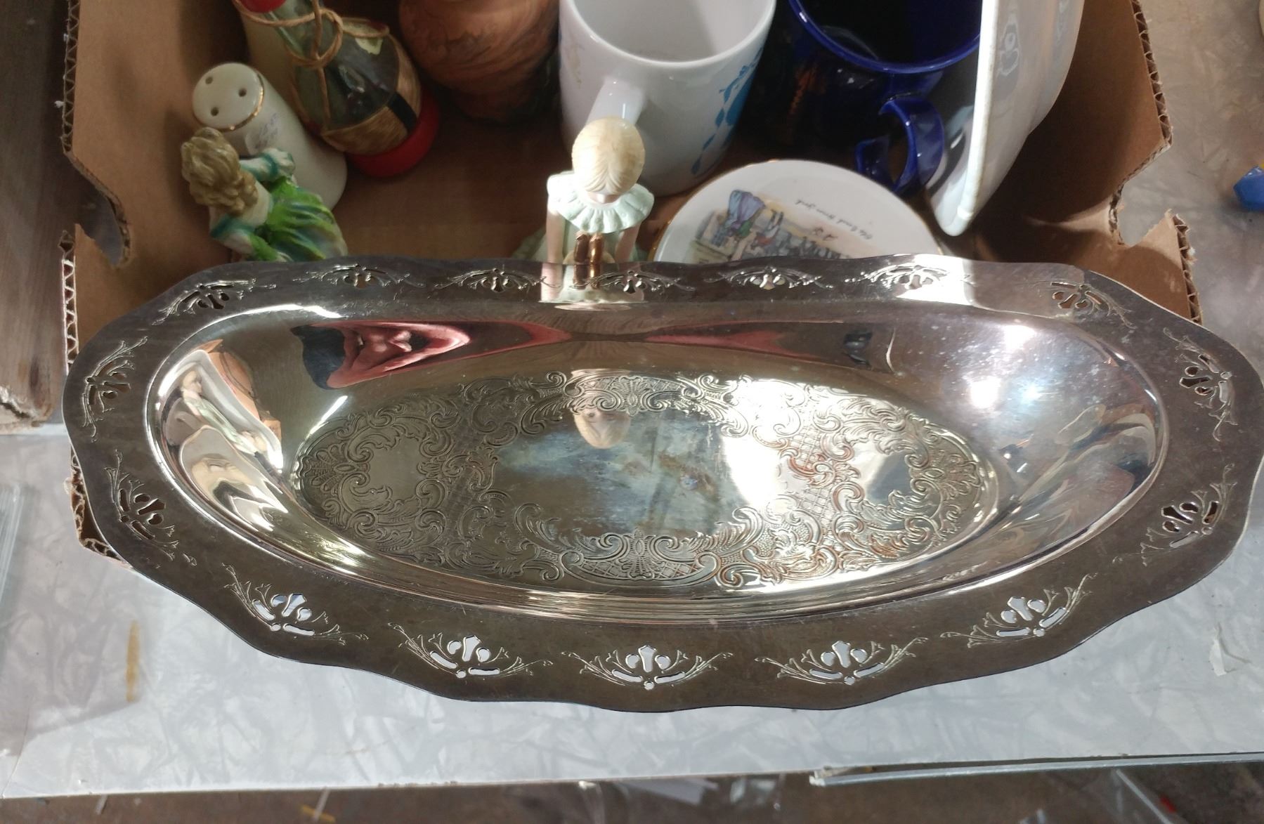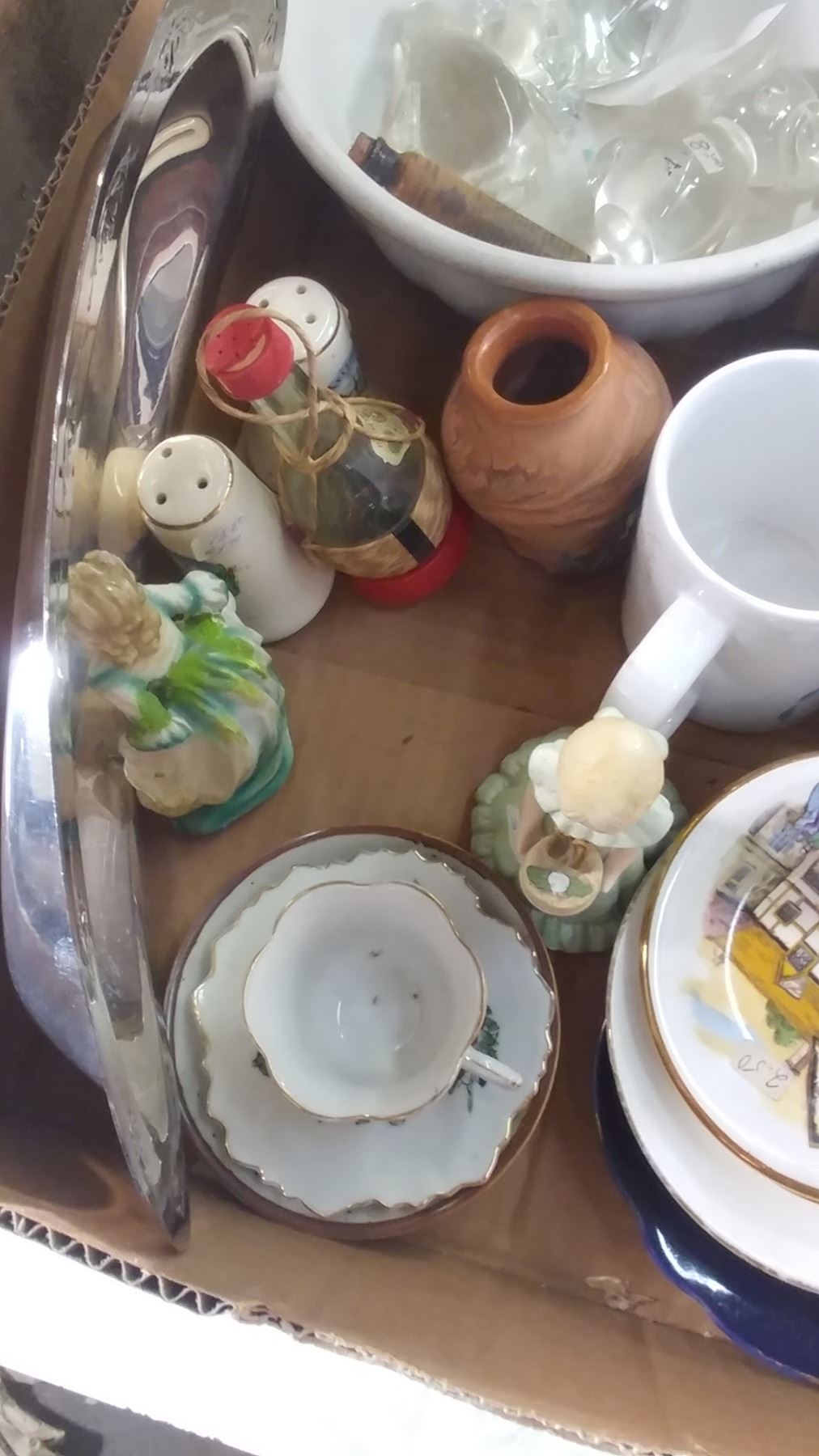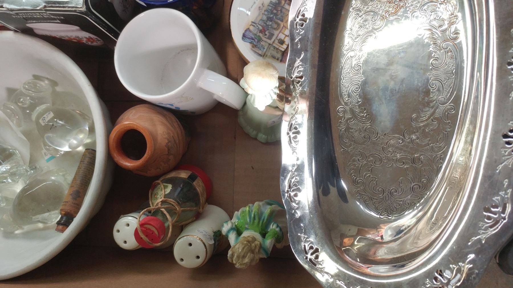 LOT OF COLLECTIBLES (SILVER PLATED TRAY, SALT & PEPPER SHAKERS, FIGURINES, ETC.)