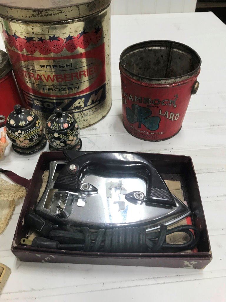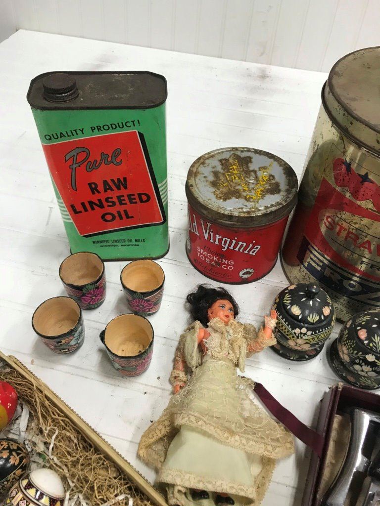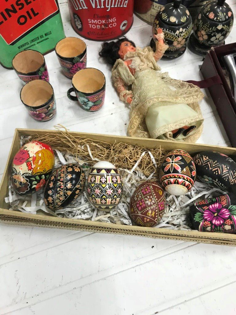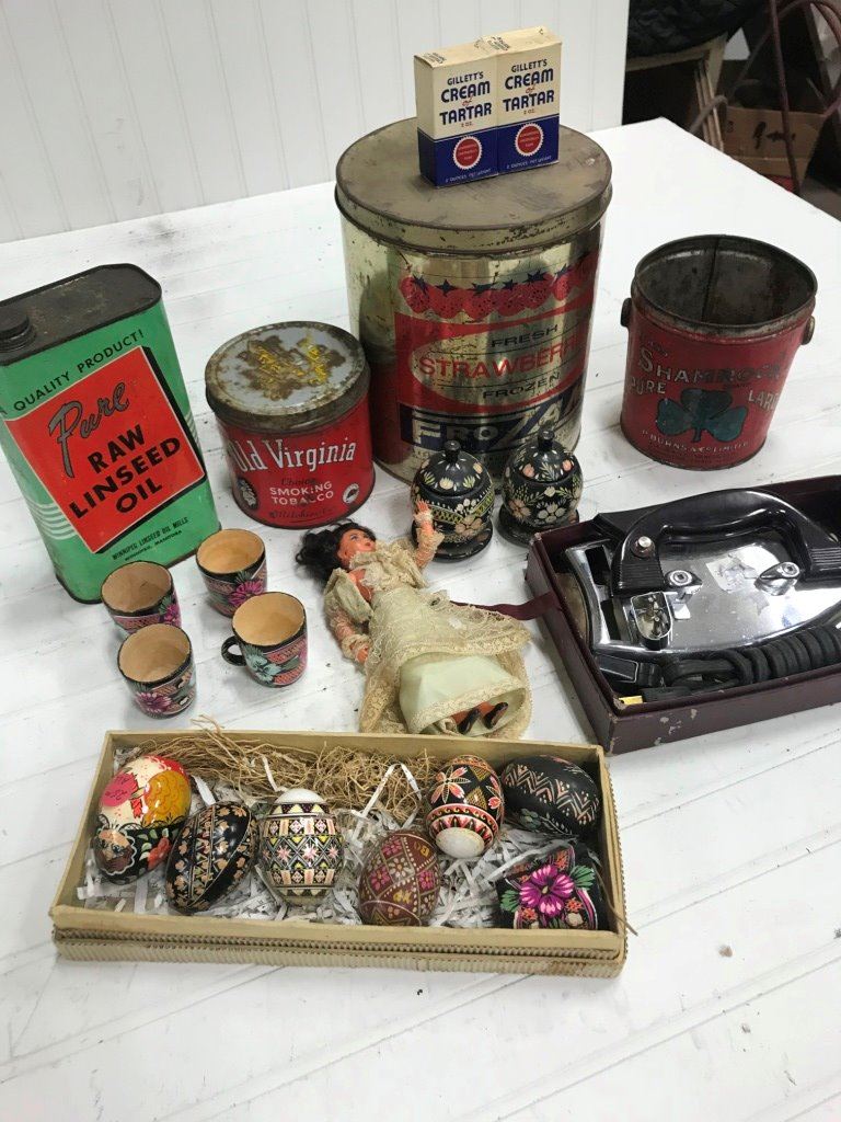 LOT OF COLLECTIBLES, TINS, PAINTER WOODEN EGGS, IRON, ETC.