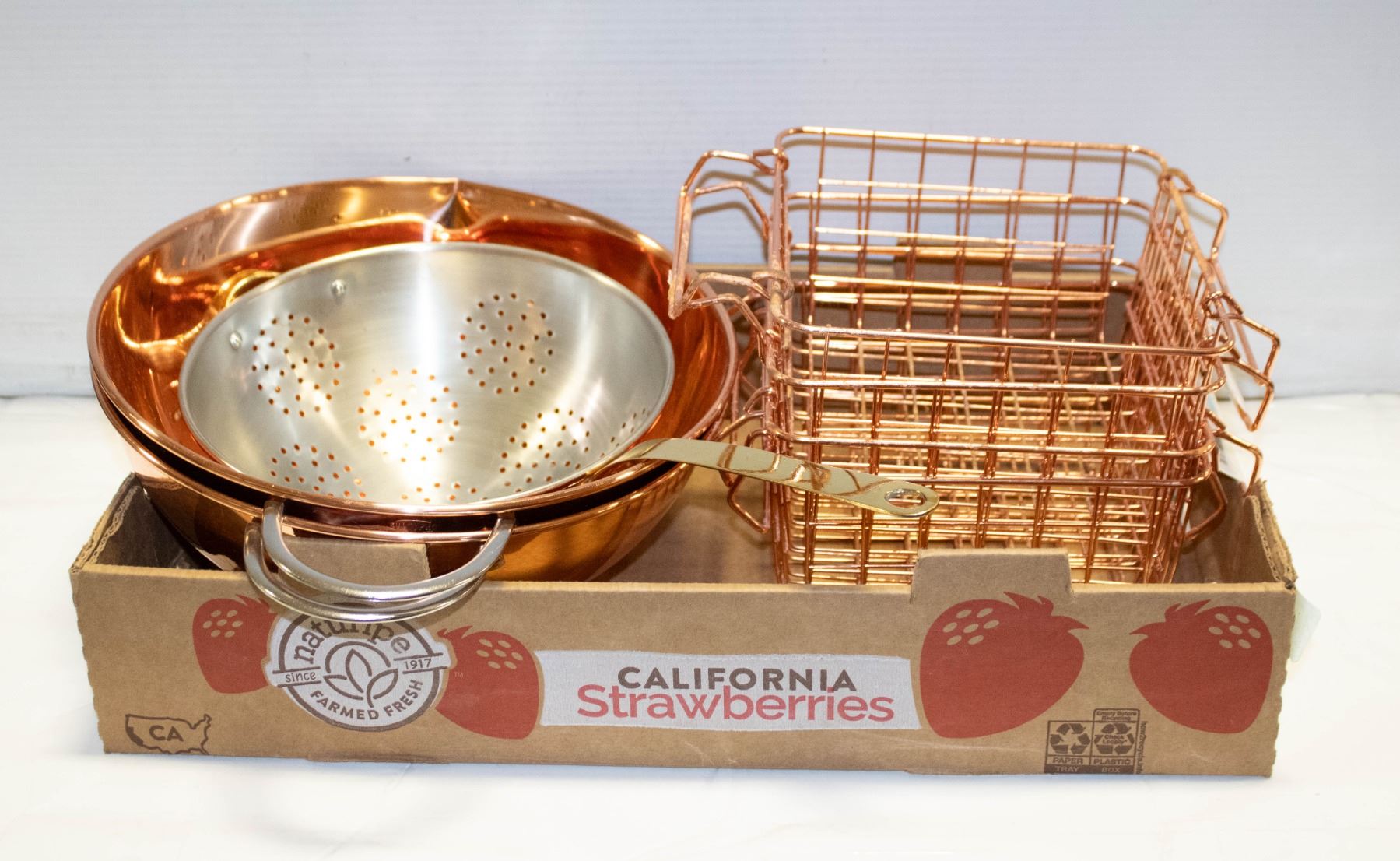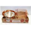 LOT OF COPPER TONED BOWLS, BASKETS, COLANDER