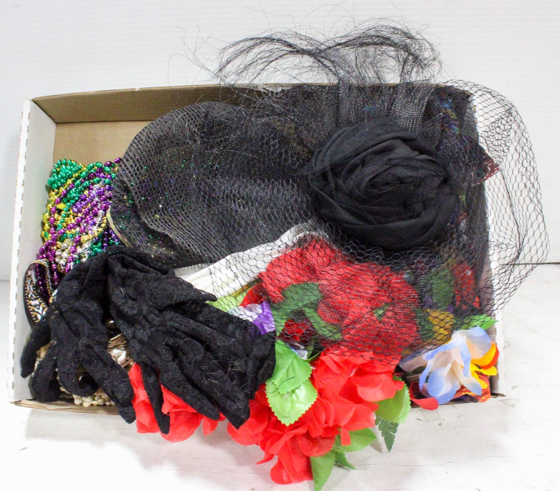 LOT OF COSTUME ACCESSORIES HATS, GLOVES, JEWELRY
