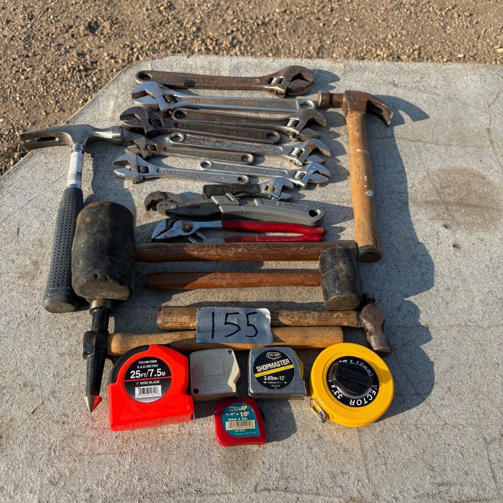 LOT OF CRESCENT WRENCHES, HAMMERS, TAPE MEASURES
