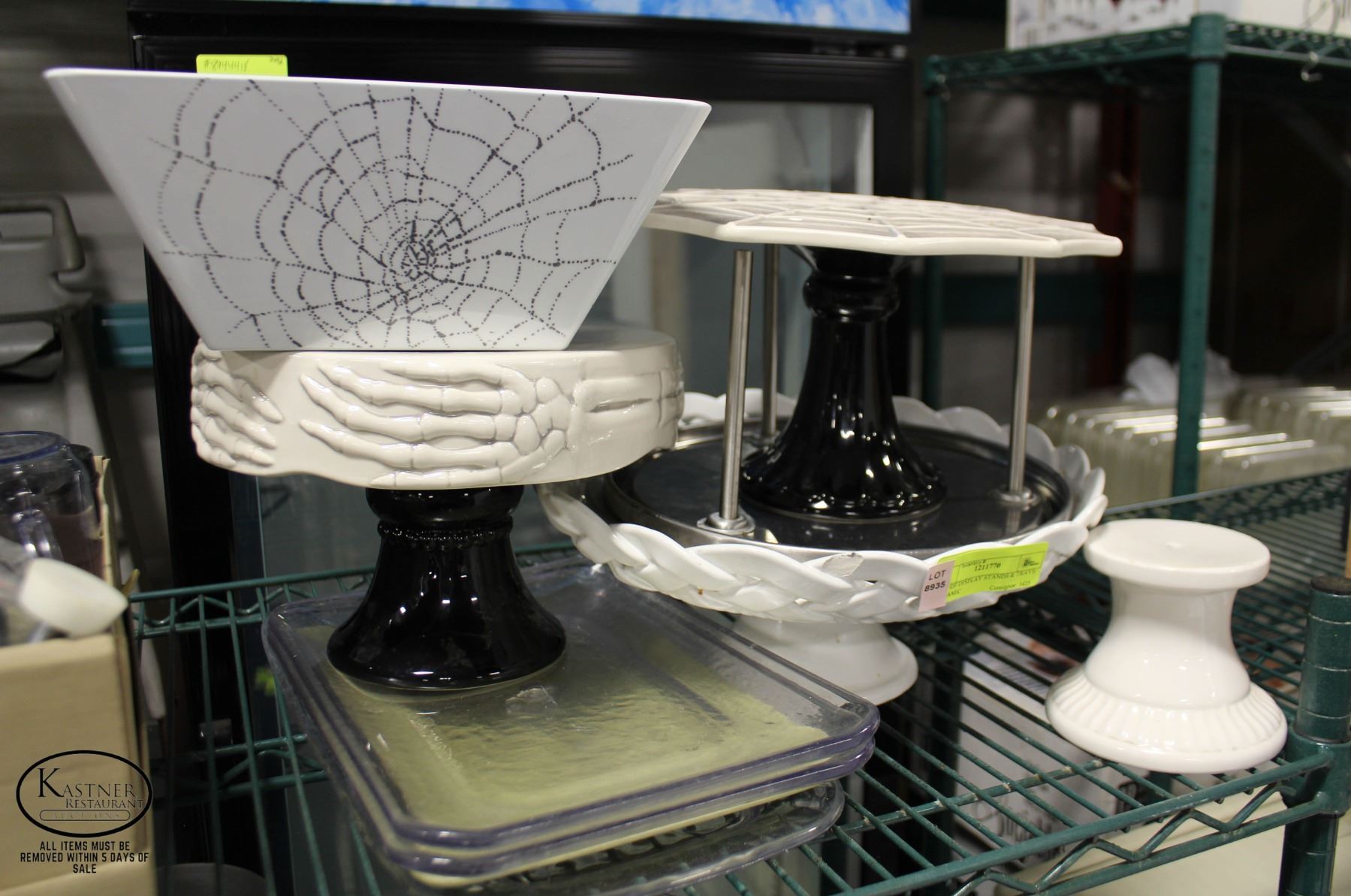 CAKE / PIZZA DISPLAYS, ONE STEEL, TWO HALLOWEEN THEMED, 4 STANDS TOTAL, BOWL & POLY TRAYS **ALL ITEMS MUST BE REMOVED BY 5PM MONDAY, JULY 3RD, 2023. ALL REMAINING ITEMS WILL BE SUBJECT TO A $6.00 PER DAY STORAGE CHARGE. ANY ITEMS REMAINING AFTER MONDAY, JULY 17TH, 2023 WILL BE CONSIDERED FORFEITED. NO REFUNDS WILL BE ISSUED FOR FORFEITED ITEMS.** TO SCHEDULE A PICK UP APPOINTMENT CLICK HERE