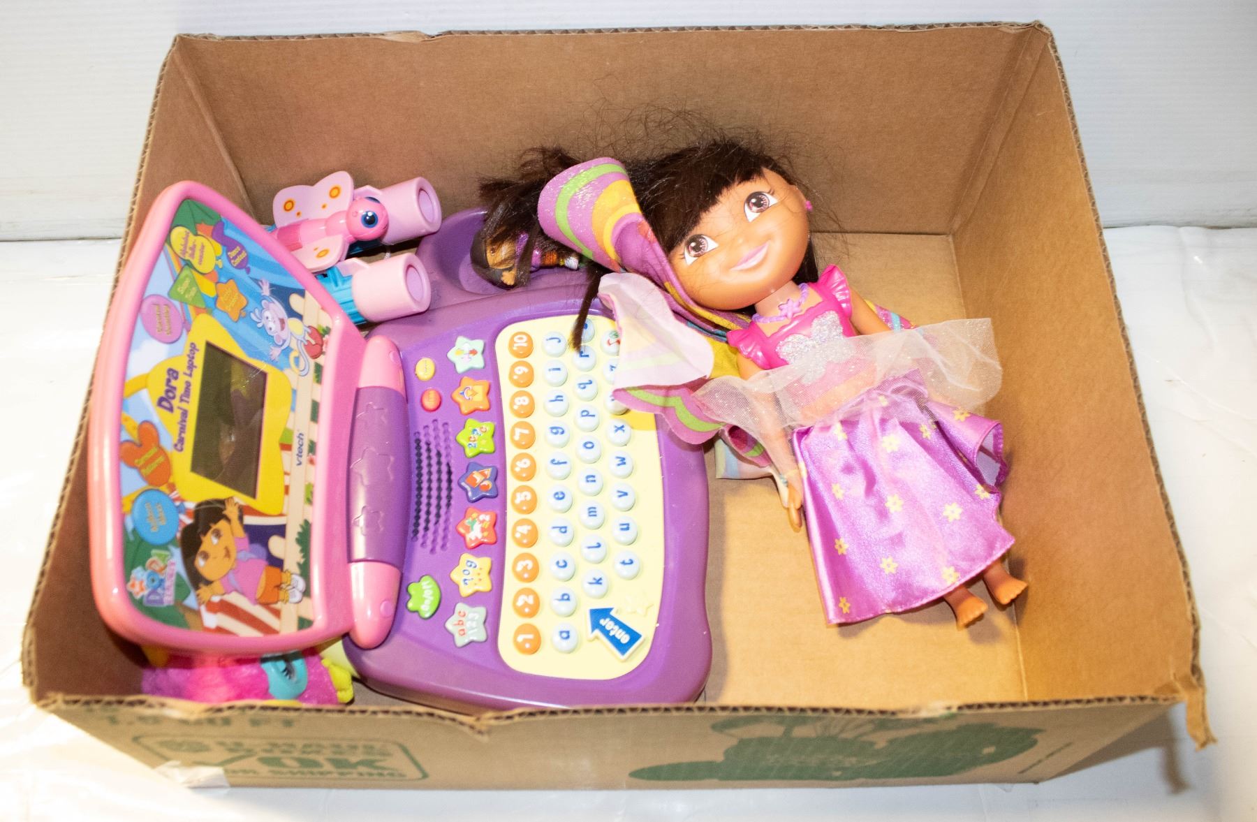 LOT OF DORA ITEMS INCLUDES DORA LAPTOP, DOLLS AND