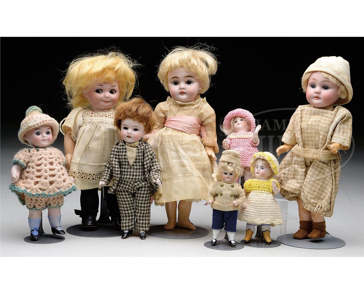 Included are two Kestner 143s both on jointed composition bodies with joints at shoulders, hips, and knees. There is also an AM 325 Googly, with brown glass sleep eyes on original five piece composition toddler body. There are five all bisque dolls, one with glass eyes and a swivel neck, a Googly with fixed glass eyes with one piece head and torso, and three small bisque children, one with glass eyes and swivel neck, one with painted eyes and swivel neck, and one with glass eyes, stationary neck, and wearing original winter clothing. SIZE: Largest 8" (20 cm) (Kestner 143s). Smallest 4" (10 cm) (Boy in original winter clothes). CONDITION: Good to very good. Googly has minor eye flake outer corner of right eye, wig not removed. 1-13308