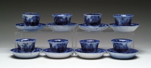 LOT OF EIGHT HANDLESS FLOW BLUE CUPS AND SAUCERS IN THE ""SCINDE"" PATTERN. Six cups with round footed bases and paneled sides and flaring rim. Two cups with paneled sides and straight foot. Six saucers are deeper than the other two. SIZE: Cups are 3in. h; saucers are 5-1/2in. 5-3/4in.. CONDITION: Very good. 9-25832
