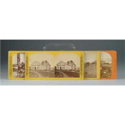 Lot # 764 LOT OF ELEVEN SHAKER STEREOPTIC CARDS. Four Kimball Photographer, Concord, NH showing the Shaker Village in Enfield, NH; two are exterior shots and two are interior shots. Four orange cards, one signed “C. E. Lewis, Lebanon, NH” birdseye view. Another signed “E. T. Brigham Lebanon, NH” outside of building. Two others with exterior views. Three other yellows, two are unmarked. One showing birdseye view, one shows barn with group of people, other signed “E. T. Brigham Lebanon, NH” of barns. Collected from Shaker community. CONDITION: Good. 9-98075 (250-400)